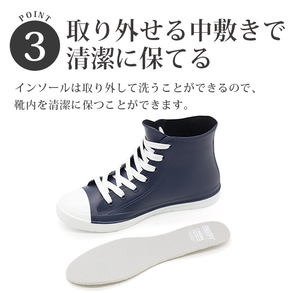 防水設計なので雨の日でも安心してお履きいただけます。ソールの溝がいろいろな方向から地面をキャッチし、グリップ力を高めます。インソールは取り外して洗うことができるので、靴内を清潔に保つことができます。柔らか素材なので、足への負担が少ないです。