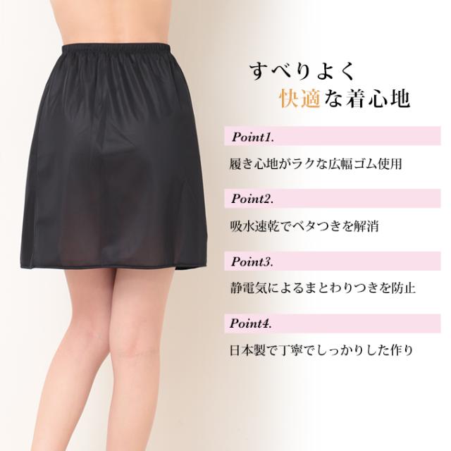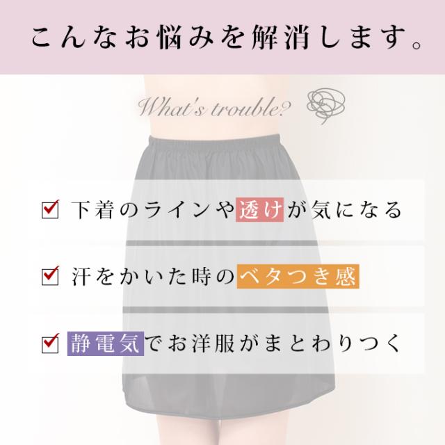 年中快適に過ごす、万能アイテム!春夏:汗を吸ってサラサラ快適!薄地のスカート・ワンピースの下に履いて透け防止!まとわりつくのを防止!秋冬:タイツやインナーボトムの上に重ね履きして、保温力アップ!& 静電気防止!