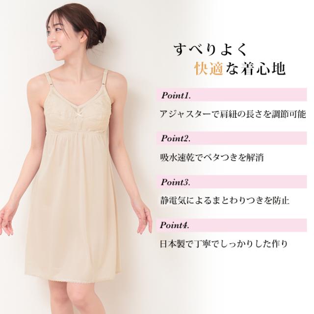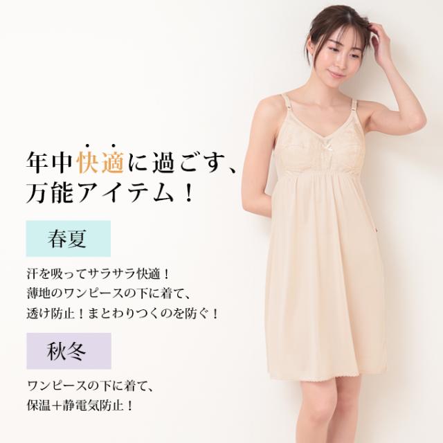 1枚で楽して綺麗フルカップブラ付きでバストを優しく包み込みます。年中快適に過ごす、万能アイテム!春夏:汗を吸ってサラサラ快適!薄地のワンピースの下に着て、透け防止!まとわりつくのを防ぐ!秋冬:ワンピースの下に着て、保温+静電気防止!すべりよく快適な着心地Point1.アジャスターで肩紐の長さを調節可能