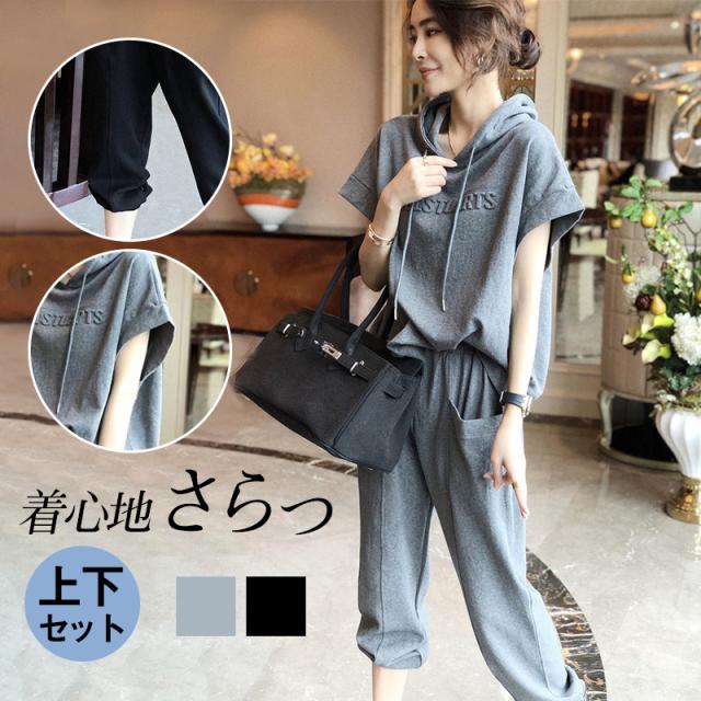 セットアップ ジャージ レディース パーカー フード付き 半袖 トップス ロングパンツ 上下セット スウェットパンツ 運動服 スポ