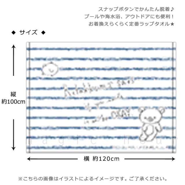 ◆ リラックマ 人気 キャラクター キッズ ジュニア 子ども ラップタオル プール タオル 100cm 子供 巻きタオル ◆ 大人気のリラックマのお着換えタオル☆ 女の子や大人にも便利な100cm丈で安心おきがえ♪ プールや運動時に大活躍の便利アイテム! 肌ざわりの良い綿生地で使い心地◎ スナップボタンでおきがえ楽々です! ・サイズ: 長さ 100cm, 横 60cm(1周 120cm) ・ロング丈で身長120から160cm位に対応。 ・お友達にも自慢したくなる可愛い柄☆ ・内側にお名前の書けるネーム付きなので学校のプールにもおすすめ! ・素材: 綿100% |