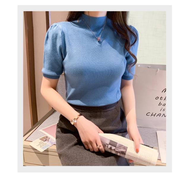 半袖 ニット レディース ハイネック サマーニット バルーン袖 リブ トップス プルオーバー インナー 無地 ゆったり きれいめ