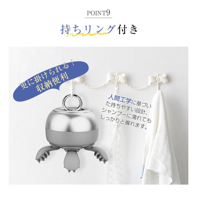 【お風呂でも使える】髪が濡れた状態でも使用できる頭皮マッサージ器です。IPX7の高い防水機能が搭載されています。万が一、湯船に落としてしまっても直ぐに引き上げれば、故障の心配もありませんので、安心してお風呂場でも使用できます。また、お手入れの際も遠慮なく水で洗い流しできるので、常に清潔な状態を保つことができます。お風呂でのリラックスタイムや、頭皮洗浄をしたい方におススメです。