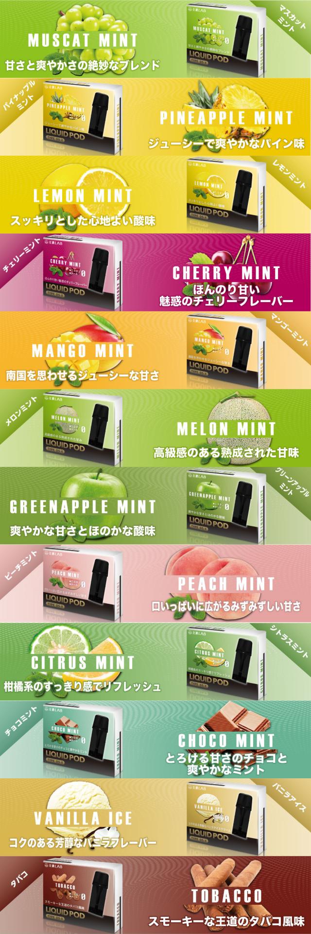 互換ラボでは、絶大な人気のメンソールフレーバーを筆頭に、人気の20種類のフレーバーをご用意致しました。アナタに合うお気に入りのフレーバーがきっと見つかるはずです。