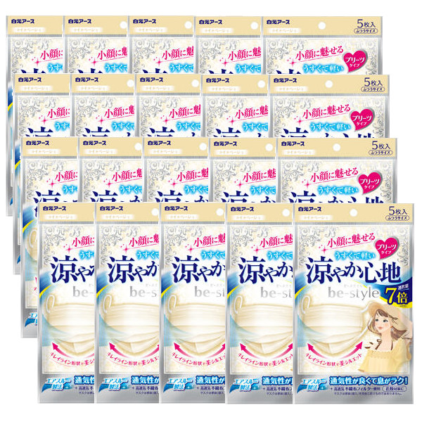 マスク 不織布 ビースタイル プリーツタイプ 涼やか心地 ライトベージュ 5枚入×20【20個セット】 送料無料 白元アース 小顔 女性用