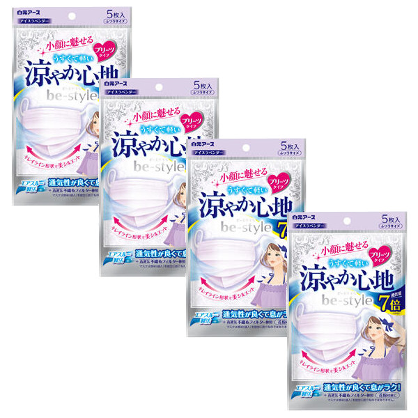 マスク 不織布 ビースタイル プリーツタイプ 涼やか心地 アイスラベンダー 5枚入×4【4個セット】【ネコポス】 送料無料 白元アース 小顔 女性用