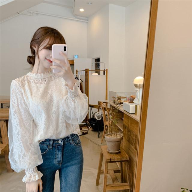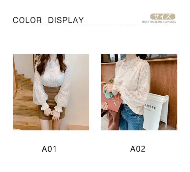 ブラウス シャツ レディース 長袖 レース トップス 総レース シースルー ハイネック 花柄 バルーンスリーブ 通勤 普段着 日常