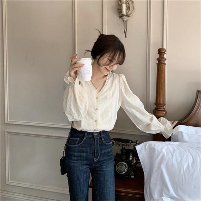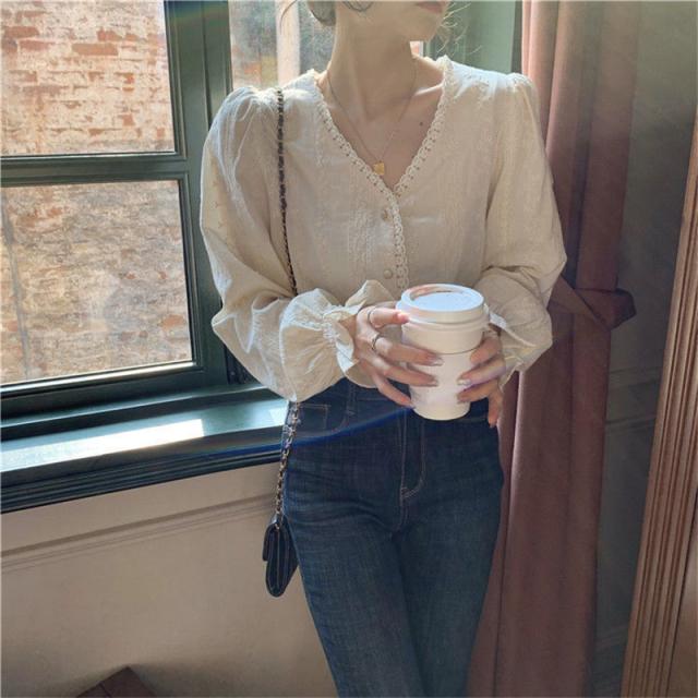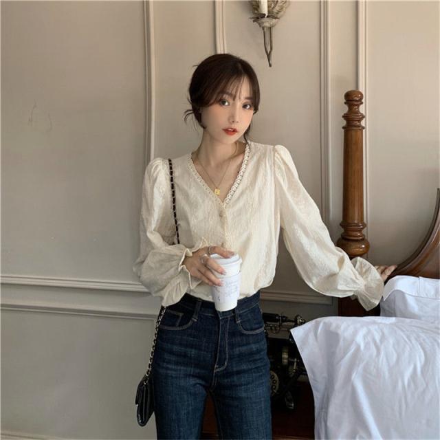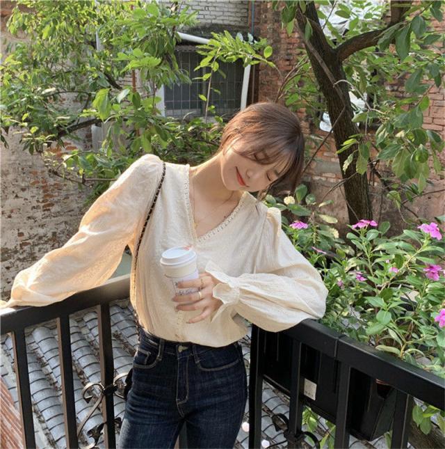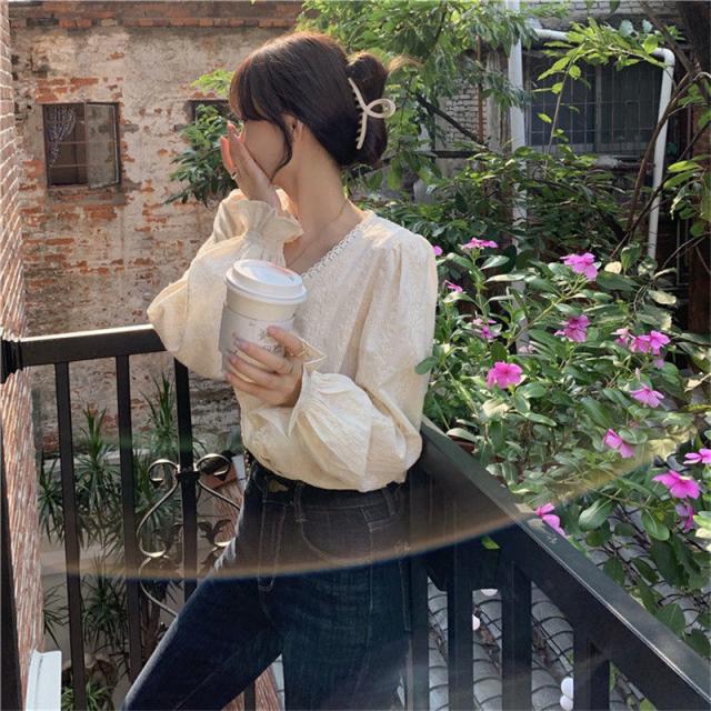 ブラウス シャツ レディース 長袖 レース トップス 総レース シースルー Vネック 花柄 バルーンスリーブ 通勤 普段着 日常