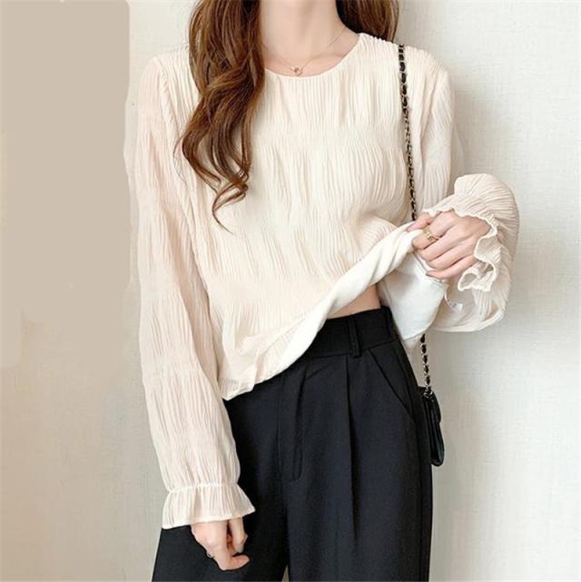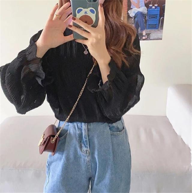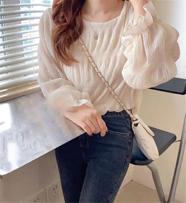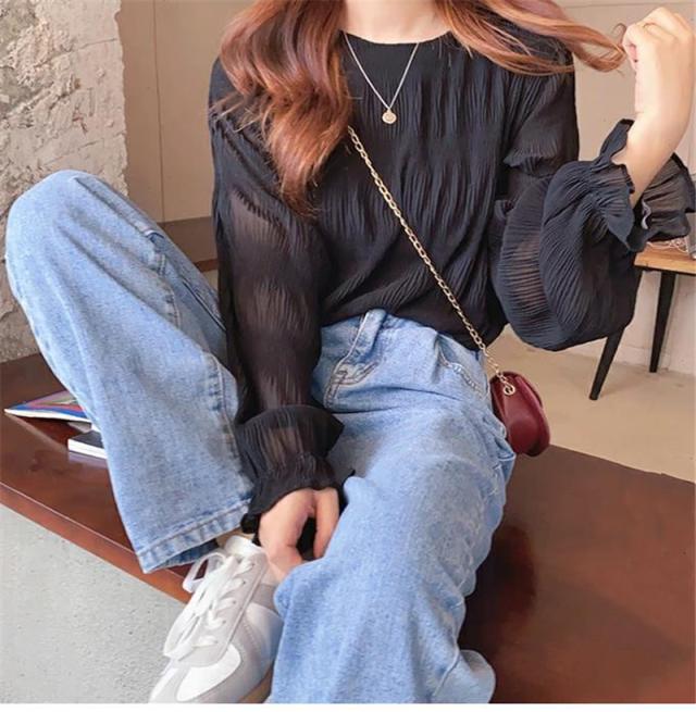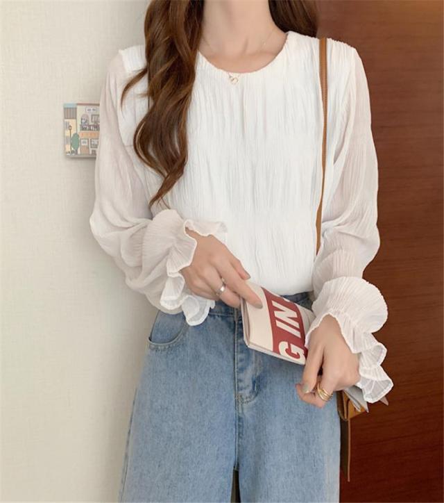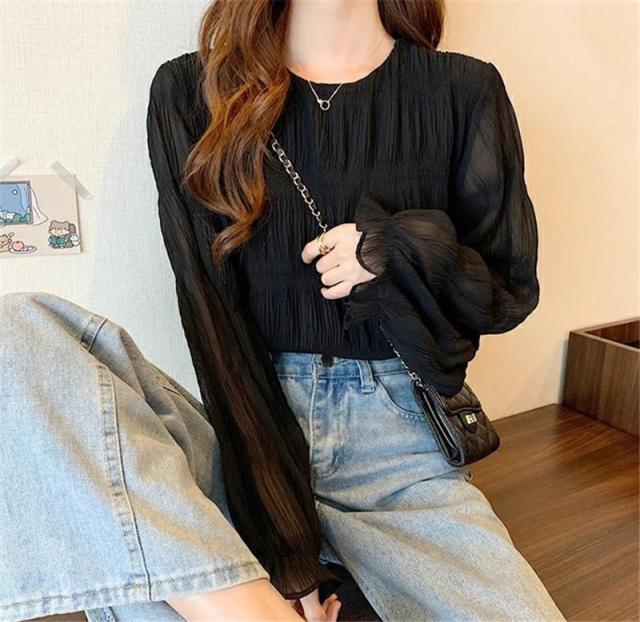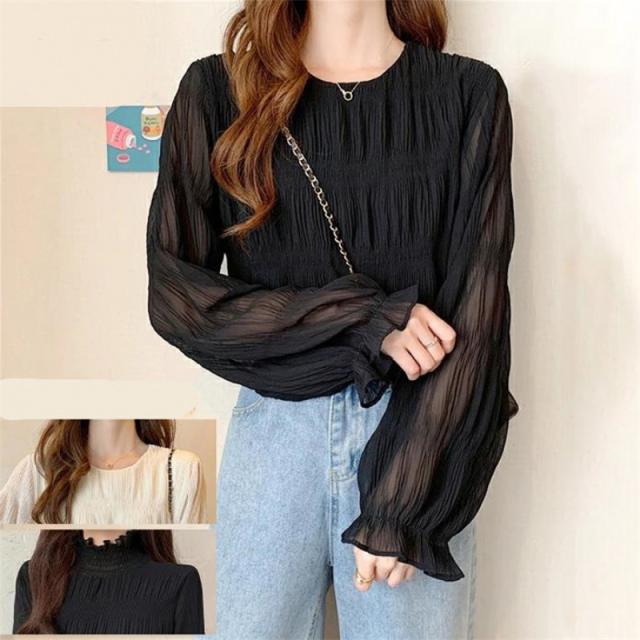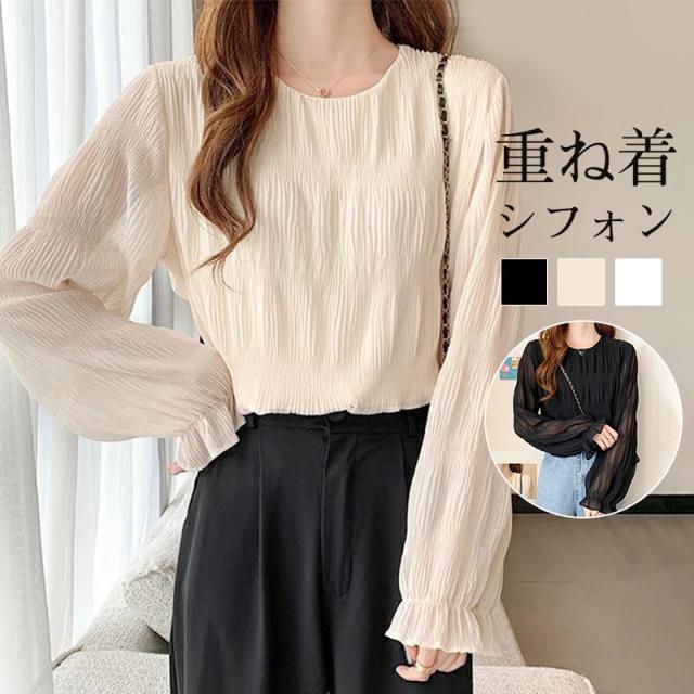 ブラウス シャツ レディース 長袖 レース トップス 重ね着 シースルー Uネック シフォン バルーンスリーブ 通勤 普段着 日常