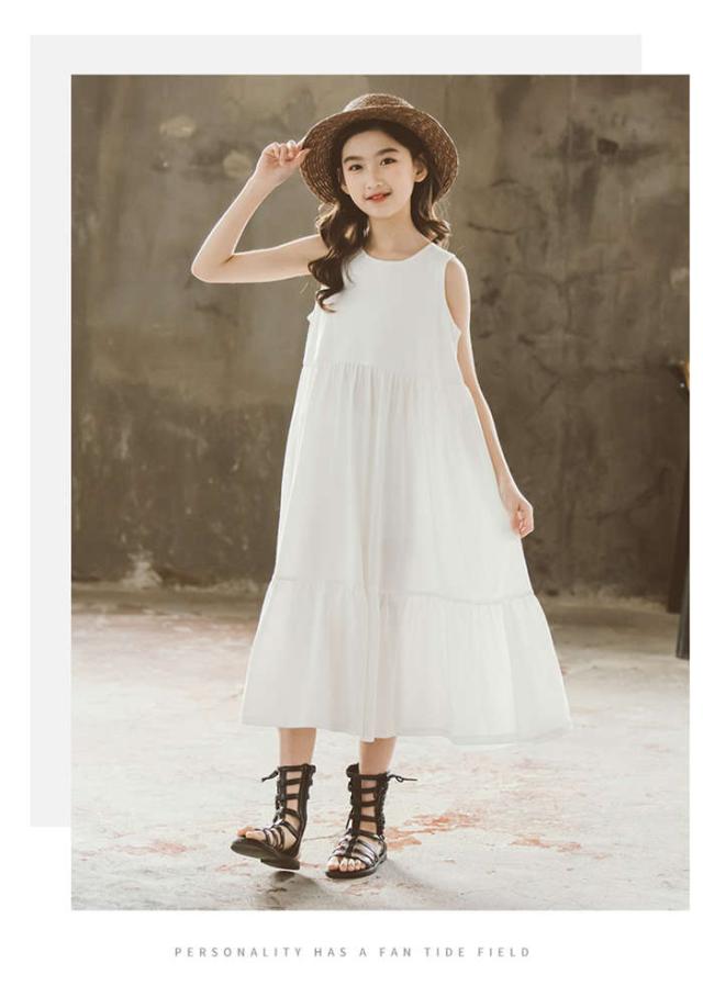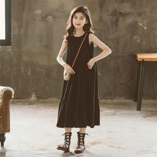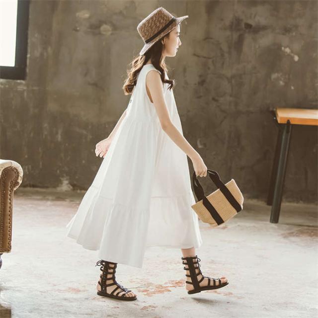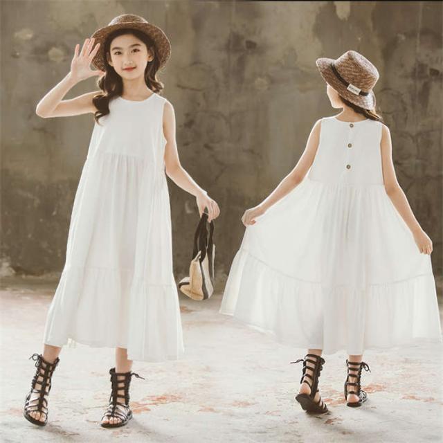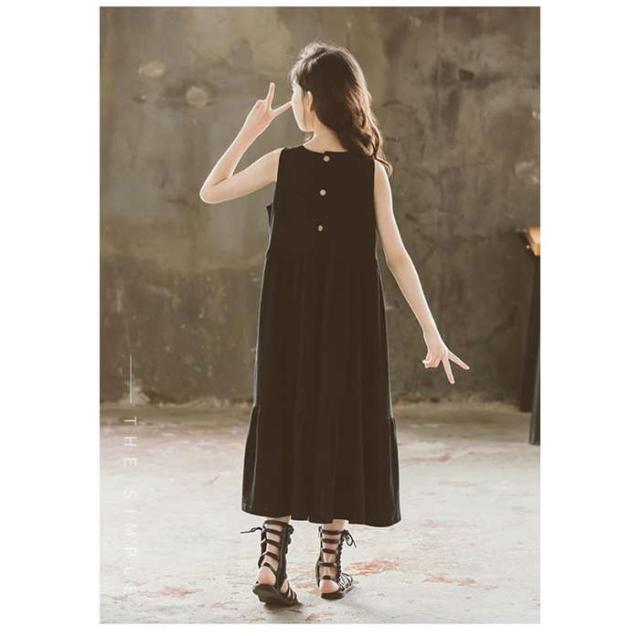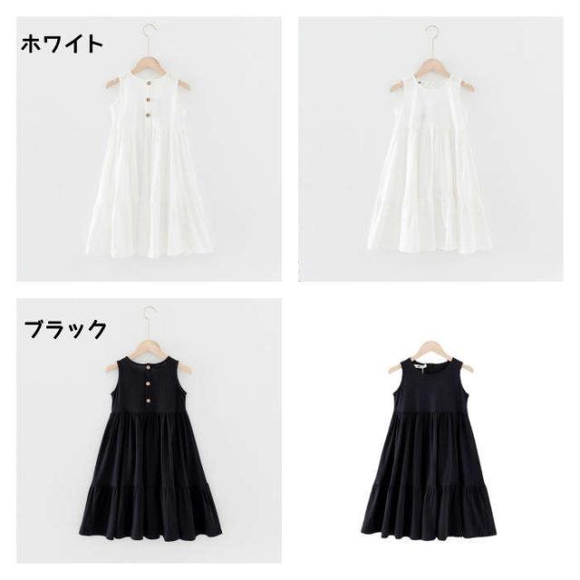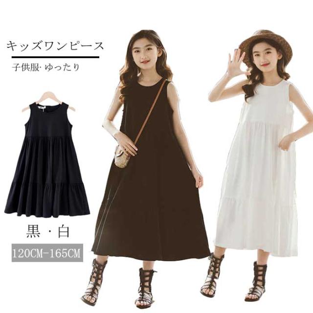 商品名:【短納期】ワンピース キッズ ロングワンピース フレアワンピース ノースリーブ 女の子 上品 サンドレス 黒 白 ホワイト ブラック Aライン ゆったり 無地 子供服 夏 春 パーティー クルーネック 大人っぽいワンピース 普段着 外出着 旅行 イベント 大きいサイズ コットン 綿 おしゃれ 可愛い シンプル 子ども ガールズ ジュニア 小学生 120 130 140 150 160 165