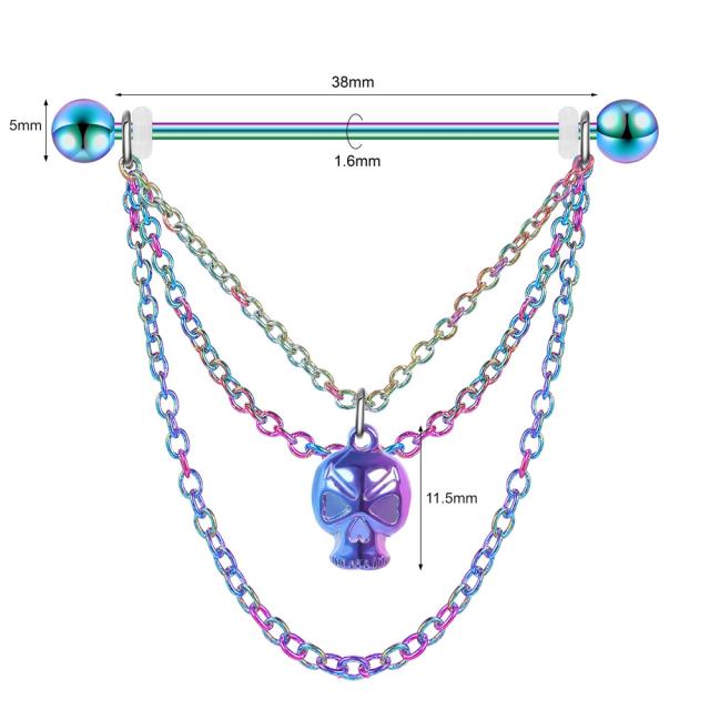 14ゲージの長いストレートバーベルに虹色の3本のチェーンをセットし髑髏(どくろ)が揺れるインダストリアル用ボディピアス。奇抜な虹色のチェーンに揺れる不気味ながい骨のチャームを3連の鎖でつなげたお洒落なボディーピアス。