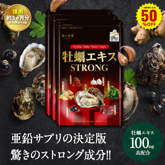 1袋単価比較で半額!【徳用/約3ヵ月分】亜鉛サプリの決定版!牡蠣エキスSTRONG サプリ (約1ヵ月分×3袋) 無臭ニンニク 金徳ショウガ ボタンボウフウ 長命草 豚レバー 鮭の白子 マカ ローヤルゼリー