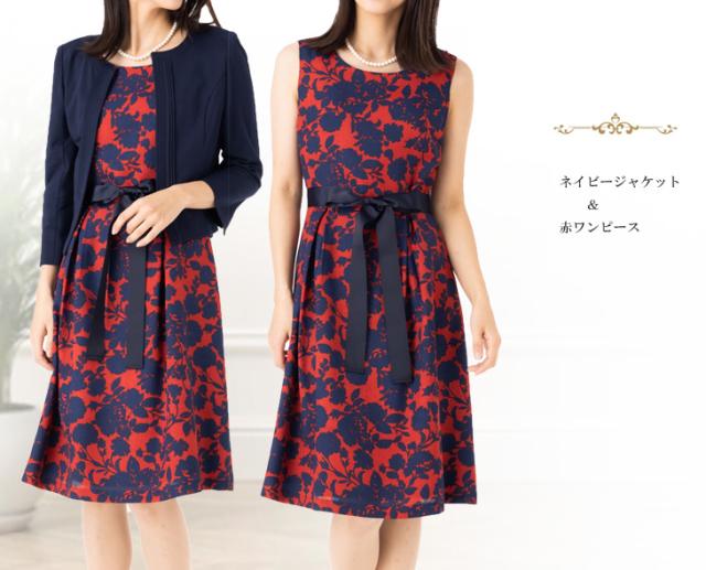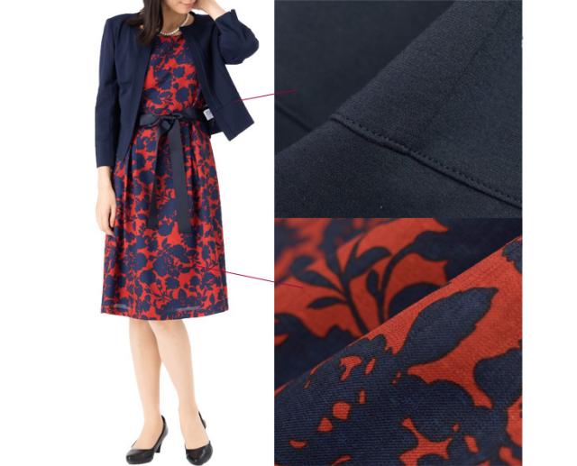 ワンピースは華やかな色合いでジャケットとの相性も◎。
