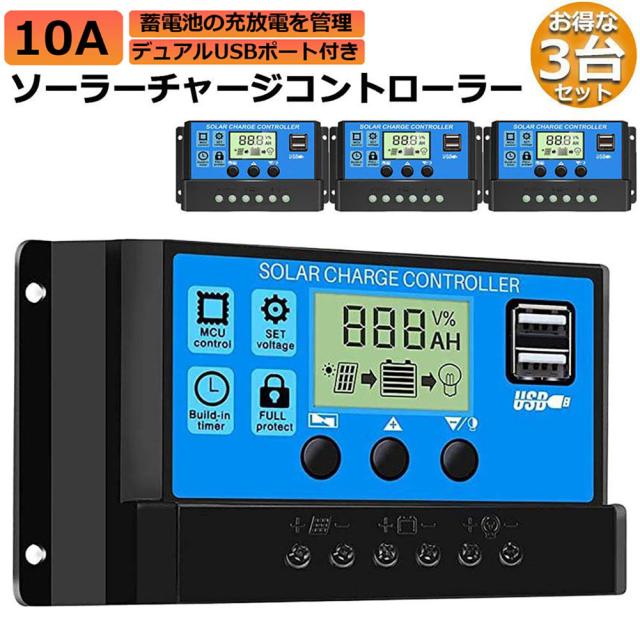 ソーラーチャージ コントローラー 3個セット 10A 12V 24V 鉛蓄電池車バッテリー充電コントローラー USBポート 付き LCD液晶表示 ソーラーパネル 太陽光パネル 接続用 過充電 過負荷 防止保護