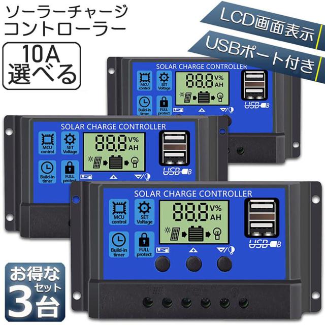 ソーラーチャージ コントローラー 3個セット 10A 12V 24V 鉛蓄電池車バッテリー充電コントローラー USBポート 付き LCD液晶表示 ソーラーパネル 太陽光パネル 接続用 過充電 過負荷 防止保護