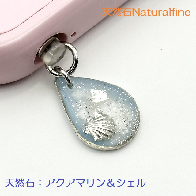 こちらは、天然石アクアマリンとシェルそしてメタルパーツの貝がらを封入したスマホピアスです!金具変更でストラップやブック式のスマホケースにもつけることができます!