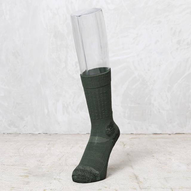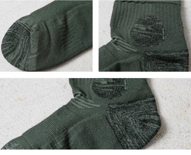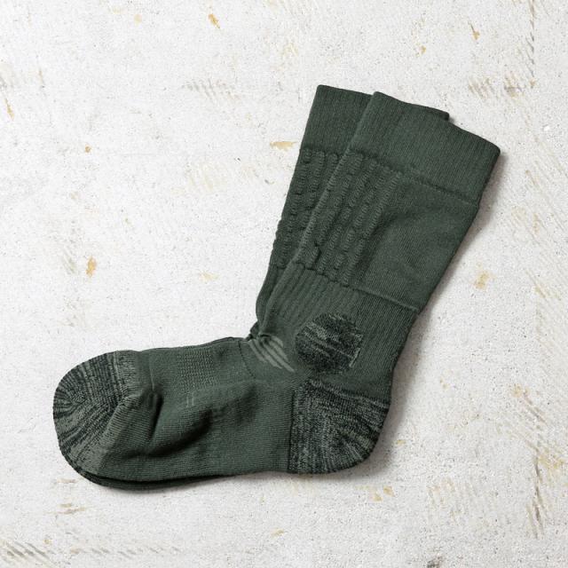 フランス軍で使用されていた体の体温調節に効果的なクールマックスソックスです。暑い気候(約15℃以上)で快適に過ごすために特別に設計されたポリエステル繊維で、速乾性、湿気の排出に優れています。 つま先、かかと、くるぶし、底の内側がパイル地になっており厚みがあり、特に傷みやすい部分の補強ともに安全性にも考慮された造り。前脛部分にもクッション性を高めてくれる独特なリブが配されています。本物の軍実用のソックスならではのカラーリングと機能性。抗菌加工も施されているので、安心して長く使用できる一足です。