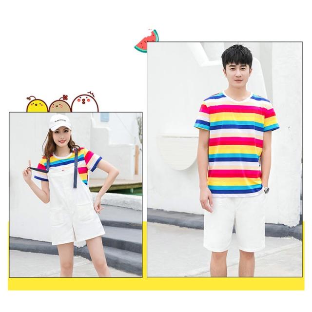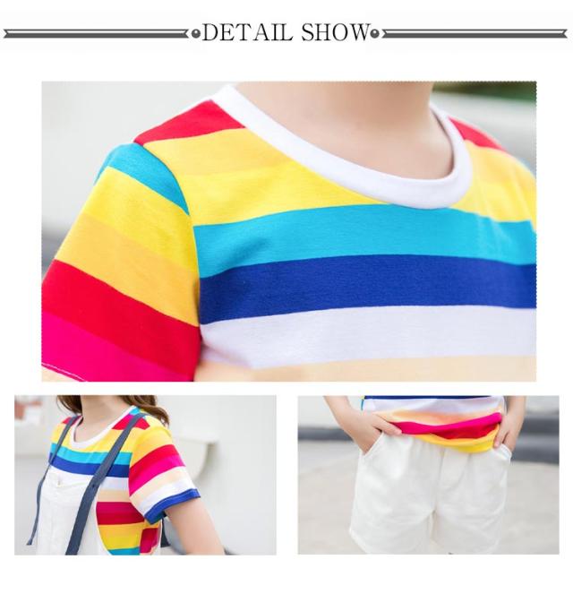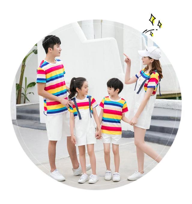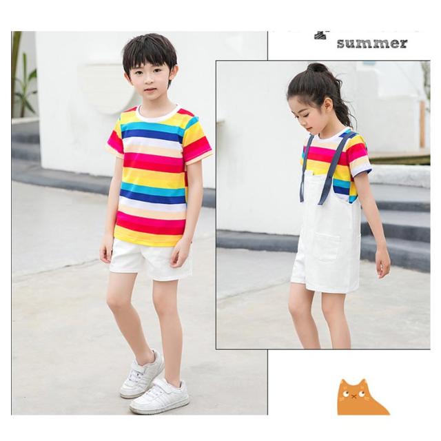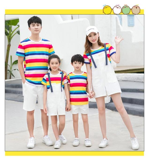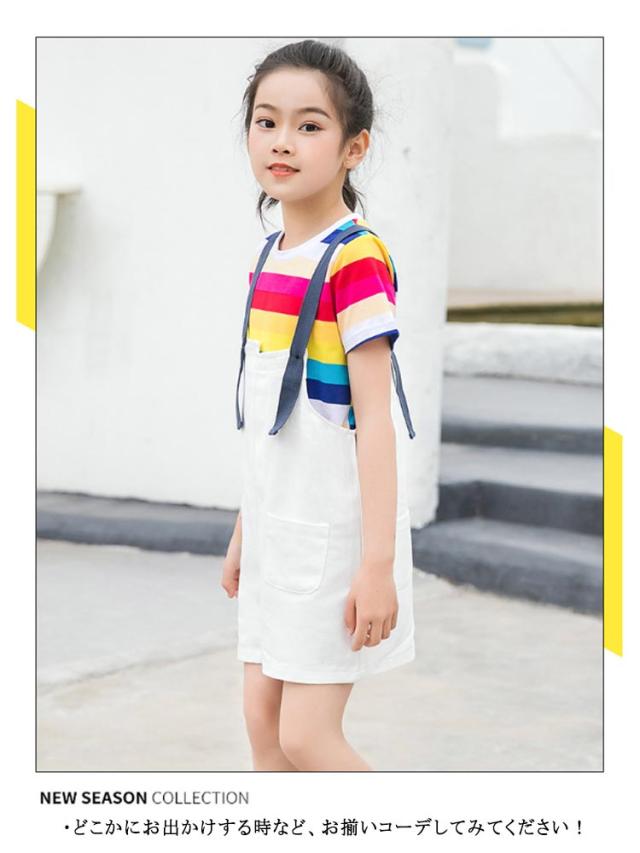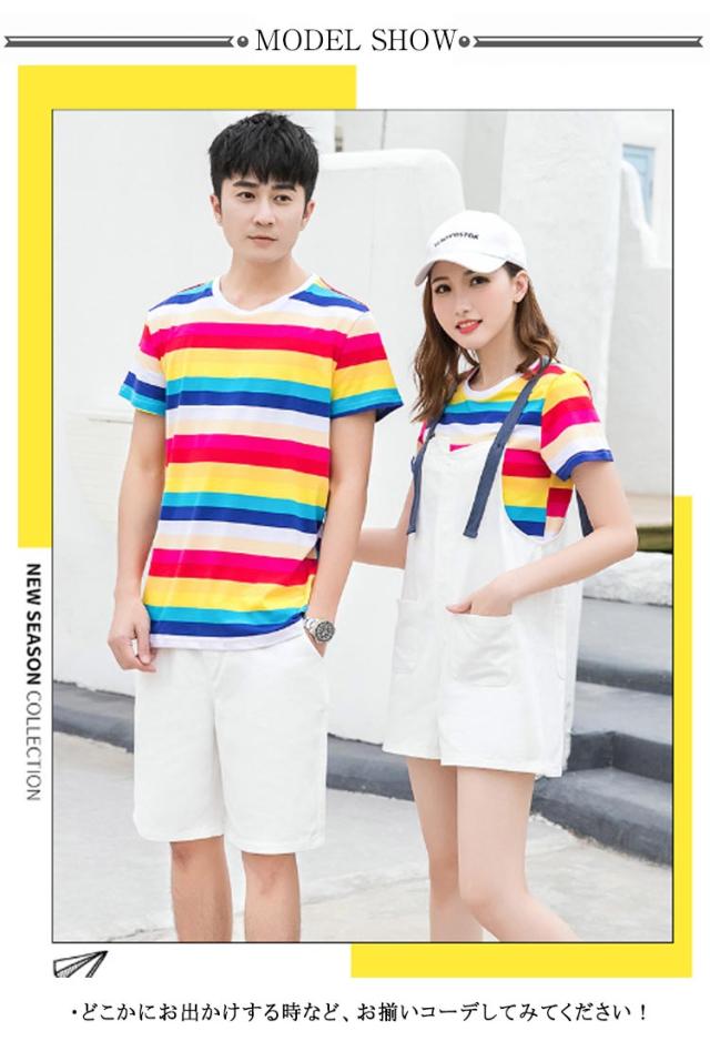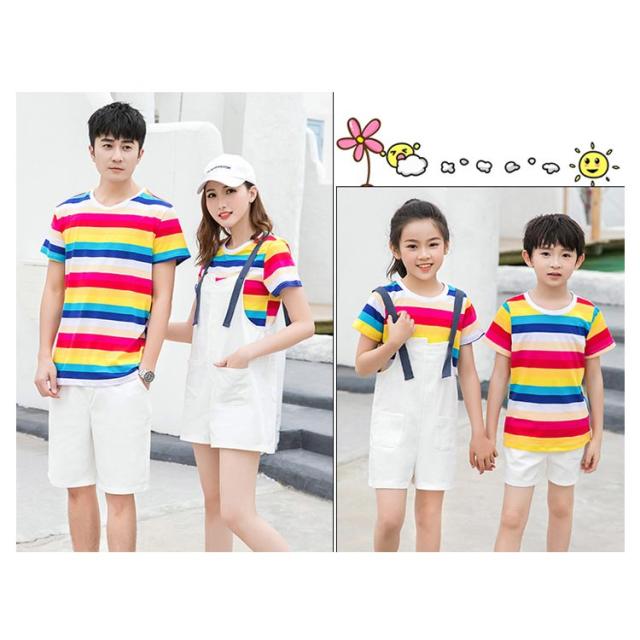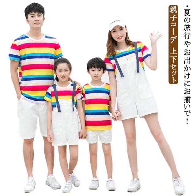 親子コーデ 上下セット Tシャツ 半袖 ショートパンツ サロペットパンツ レインボー ボーダー柄 クルーネック 親子ペアルック お揃い ファミリー パパ ママ ギフト 父の日 子供服 メンズ レディース 綿混素材 可愛い 夏 旅行 海