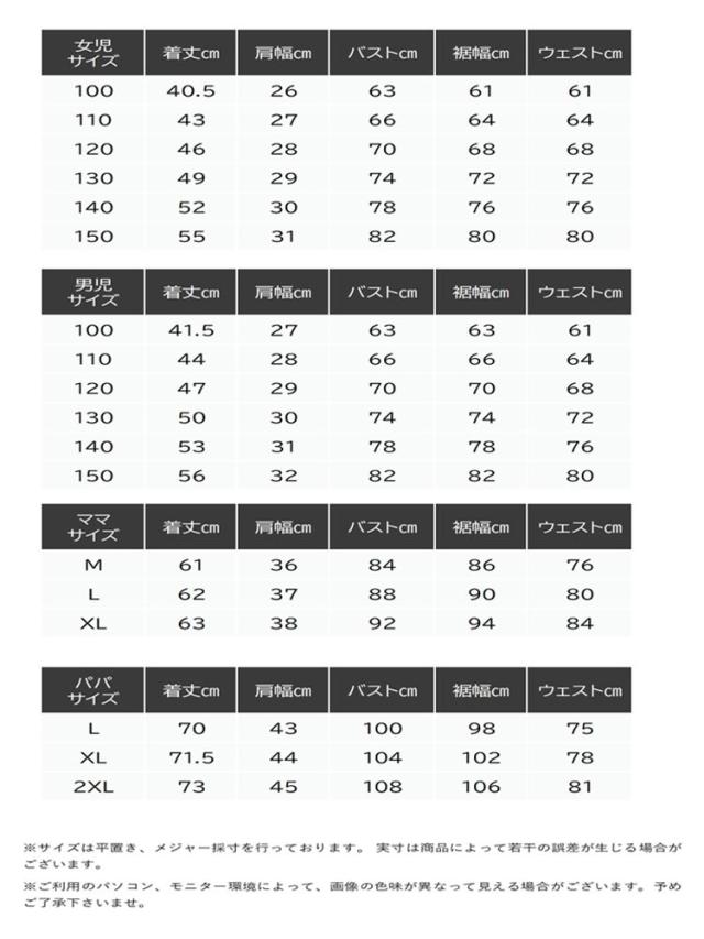 | サイズ | 男児90 男児100 男児110 男児120 男児130 男児140 男児150 女児90 女児100 女児110 女児120 女児130 女児140 女児150 ママM ママL ママXL パパL パパXL パパ2XL |