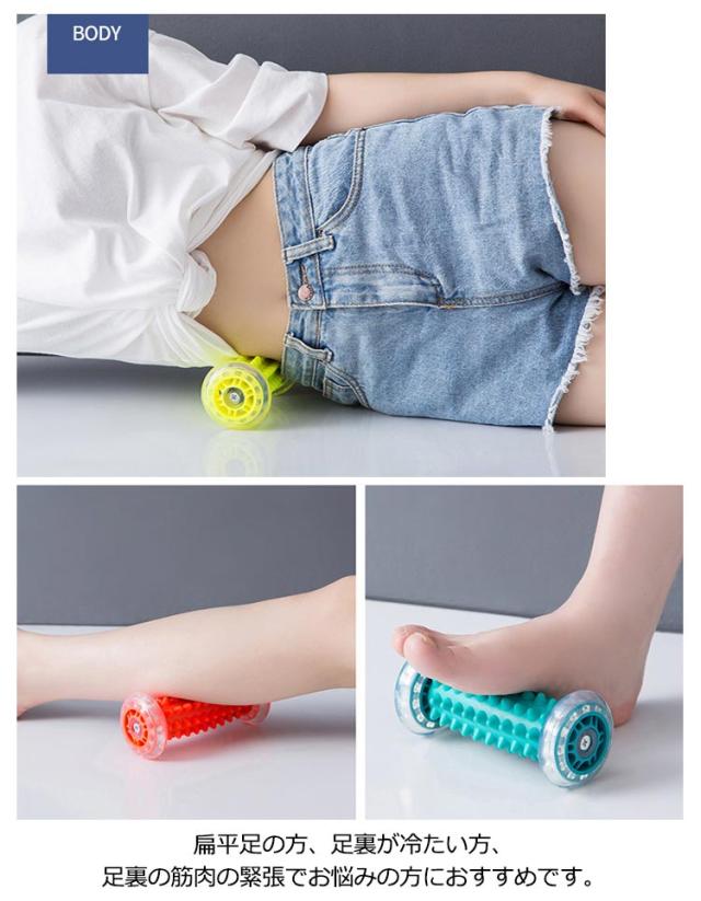 | ・1日の疲れをほぐしてくれる、フットローラー ・立ち仕事、ハイヒール、ジムでのトレーニングなどで溜まった乳酸や脚のうっ血を軽減し、素早い回復と痛みの緩和、疲労の解消に役立つマッサージローラーです。 ・足裏や土踏まずはもちろん、ふくらはぎ、ふともも、二の腕など様々な箇所のマッサージに最適です。 ・扁平足の方、足裏が冷たい方、足裏の筋肉の緊張でお悩みの方におすすめです。 ・コンパクトサイズなので持ち運びにも便利で、外出先でも気軽に使用できます。 | |