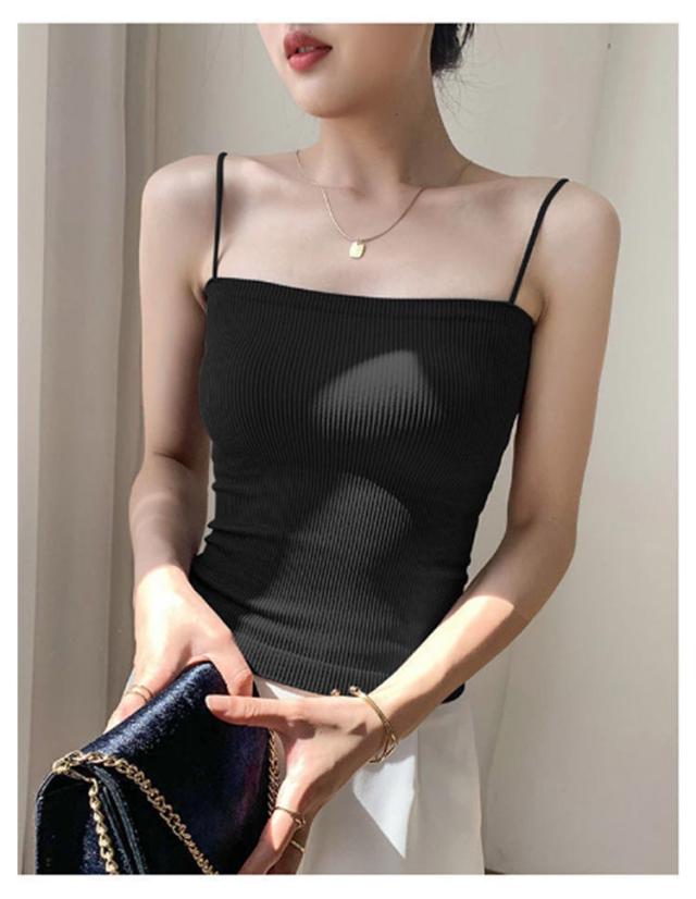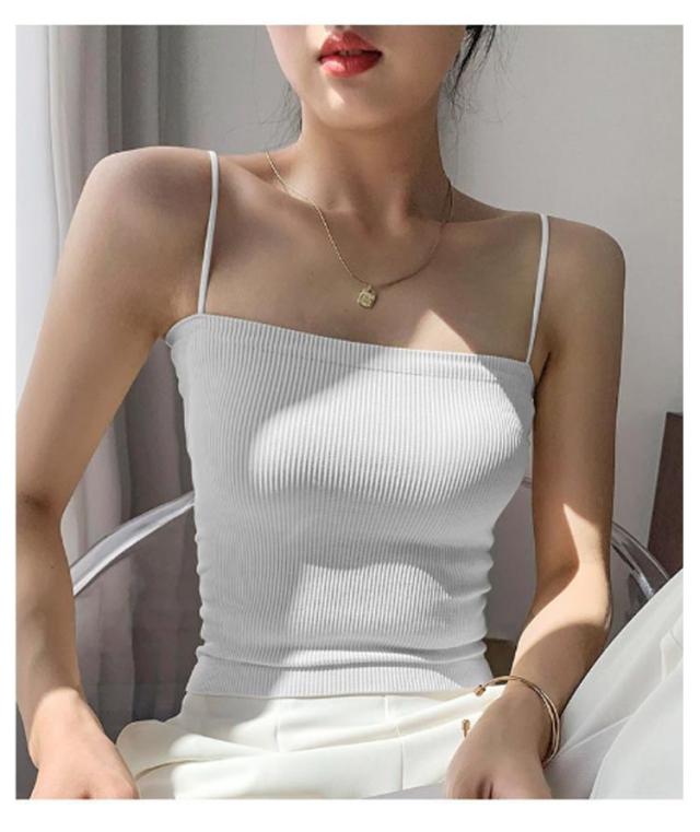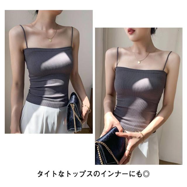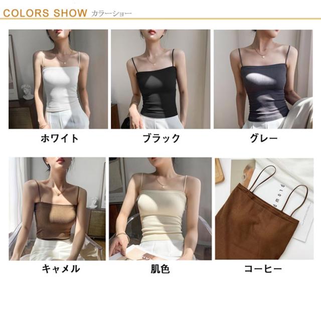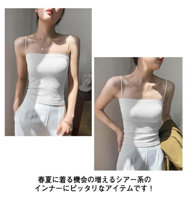 | 選べる6色! 【 カップ付きナローストラップリブキャミソール 】 華奢なストラップでヘルシーに魅せるカップ付きキャミソール。 華奢なストラップがトップスに響きにくいので タイトなトップスのインナーにも◎ 春夏に着る機会の増えるシアー系のインナーにピッタリなアイテムです! | |
