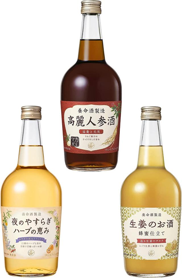 ■高麗人参酒:りんご果汁、ナツメ、チンピ、リュウガン、エゾウコギ、クコの実、ガラナ、ブラックペッパー、カルダモン、乾燥高麗人参、ナルコユリ、甜杏仁、カンカニクジュヨウ、蒸し高麗人参、マカ、霊芝、醸造アルコール(国内製造)、食塩、イソマルトオリゴ糖シラップ、黒糖蜜、砂糖/カラメル ■生姜のお酒:ショウガ汁、ゆず果汁、乾燥ショウガ、蒸しショウガ、チンピ、ナツメ、サンザシ、花椒、イチョウ葉エキス、ベニバナ、ローズマリー、シナモン、高麗人参、フェンネル、エルダーフラワー、トウガラシ、醸造アルコール(国内製造)、ショ糖、はちみつ/酸味料 ■夜のやすらぎハーブの恵み:あんず果汁、甜杏仁、クロモジ、カモミール、ねむの木、クコの実、時計草、サンザシ、リュウガン、高麗人参、カルダモン、シナモン、ラベンダー、クローブ、花椒、ベニバナ、醸造アルコール、イソマルトオリゴ糖シラップ(国内製造)、ショ糖/酸味料