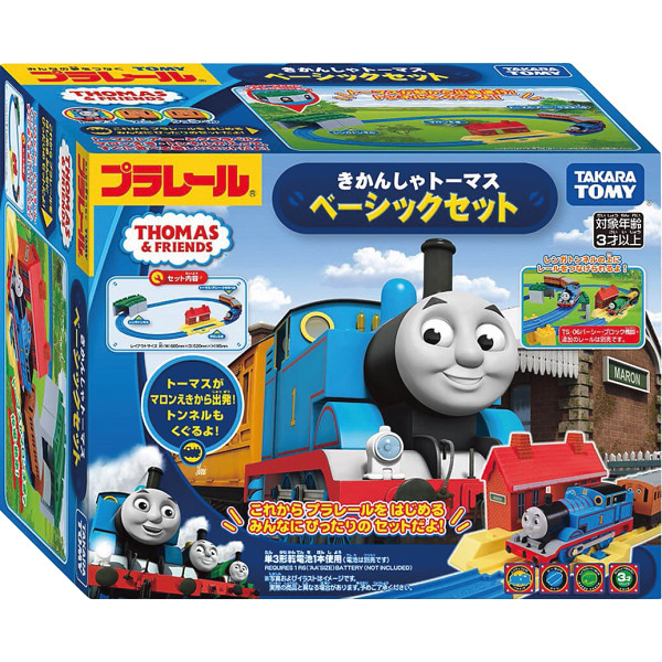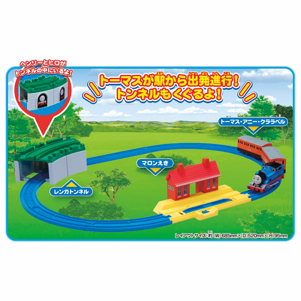 プラレールトーマスをはじめるお子様におすすめ!トーマス(動力車)とアニー&クララベル(貨車)、マロン駅とレンガトンネル2個にレールが付いた、トーマスの世界観が楽しめるセットです。