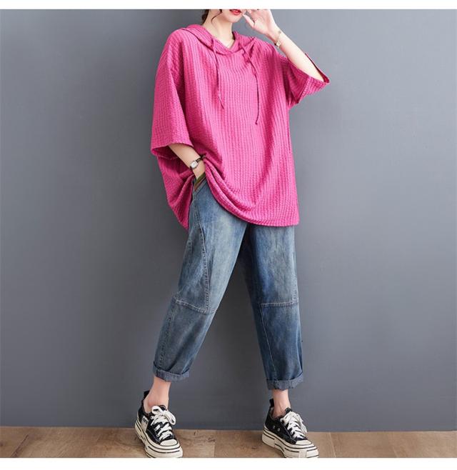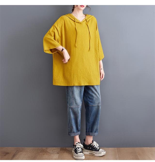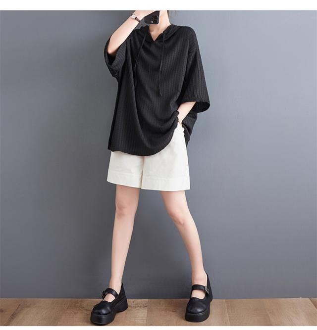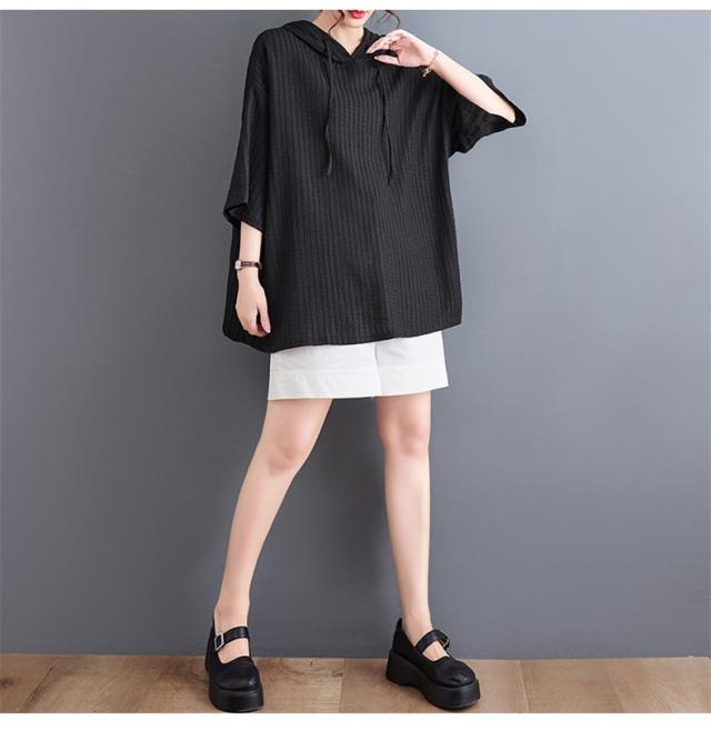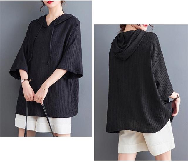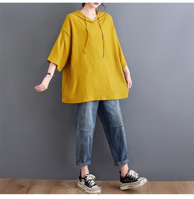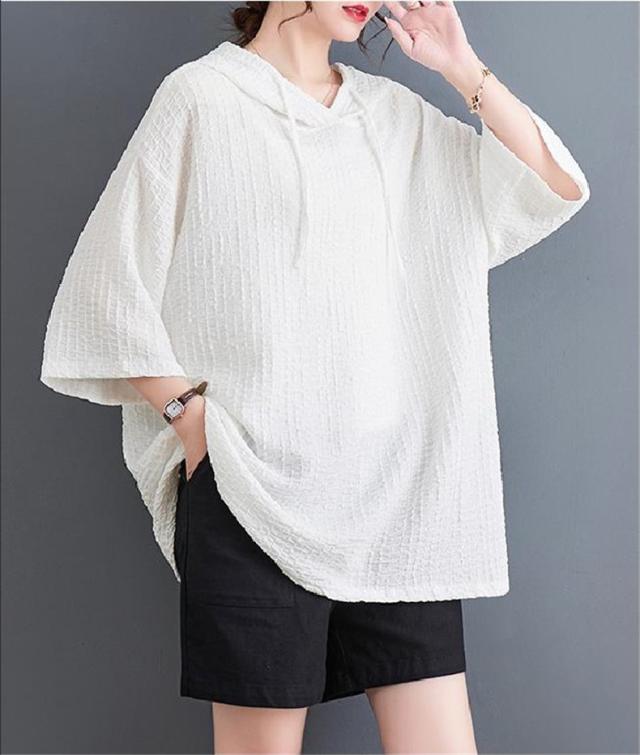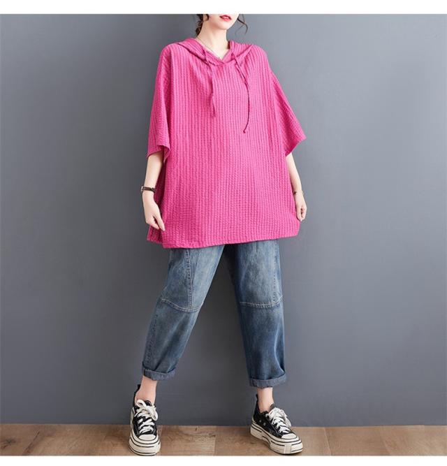 ボロシャツ レディース パーカー風 ゆったり 無地 サマー Tシャツ フード付き 五分袖 カットソー レトロ お洒落 スッキリとした着こなしにも