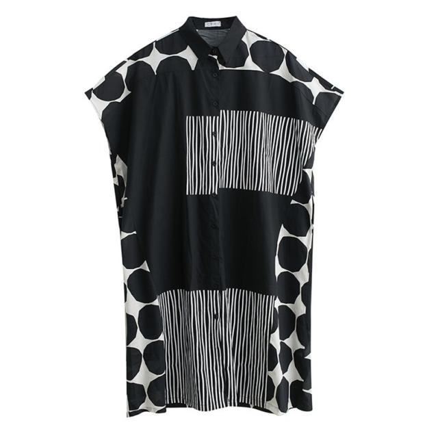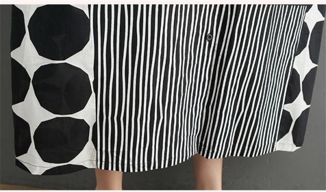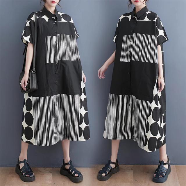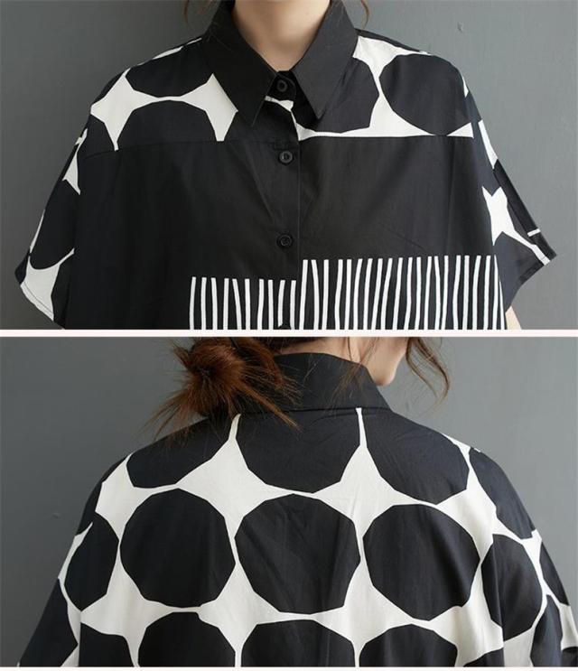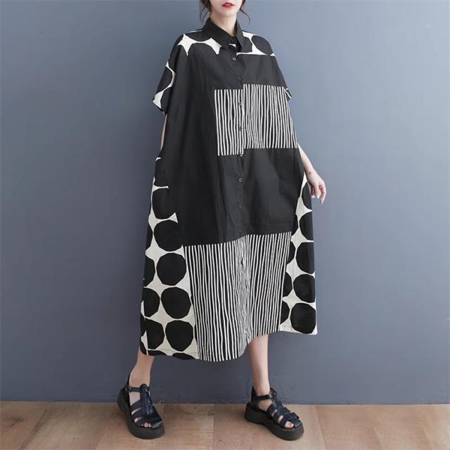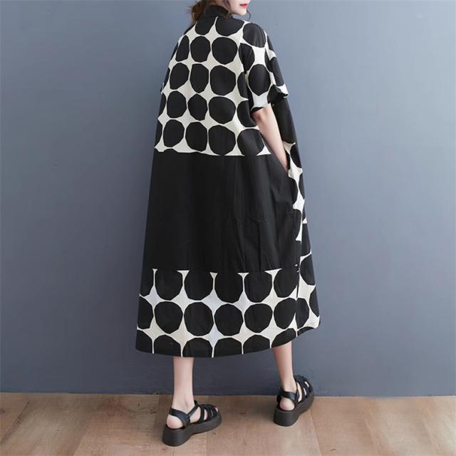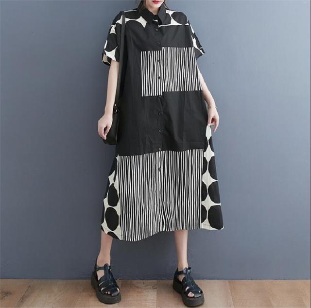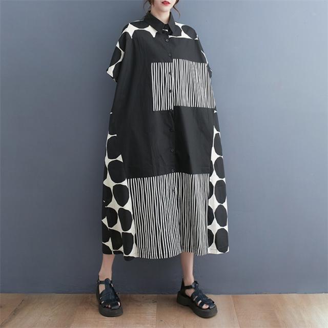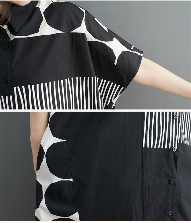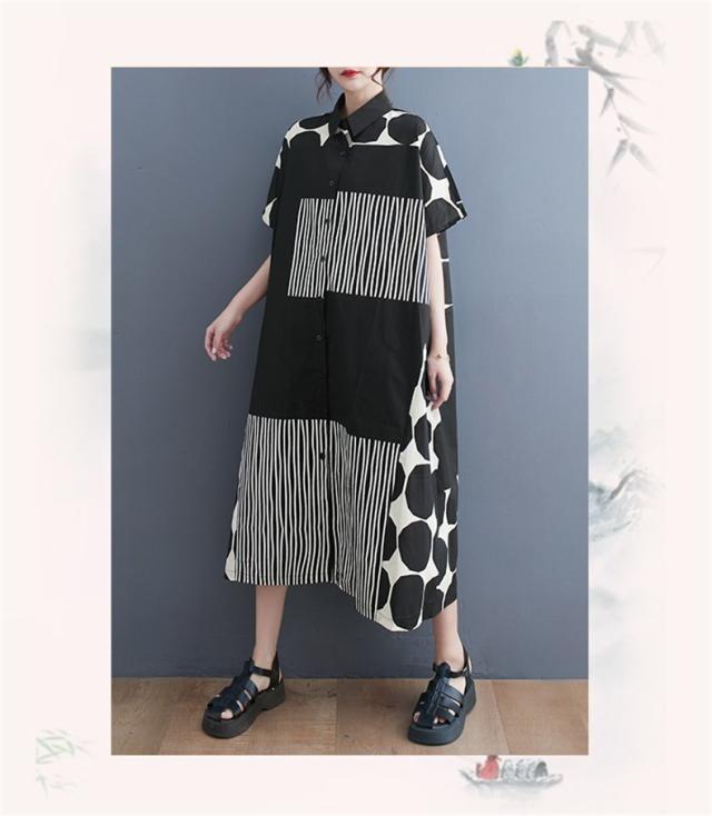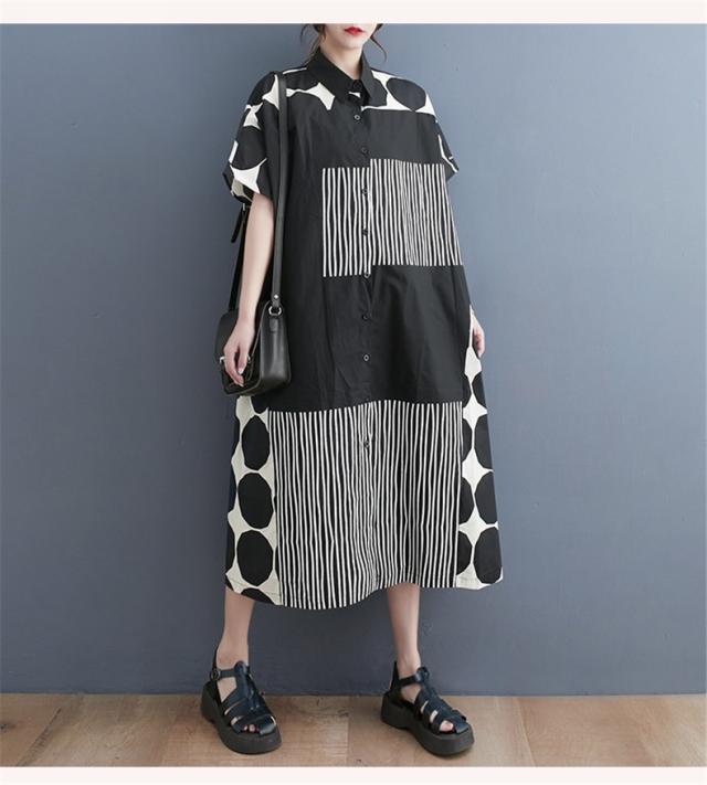 シャツワンピース レディース ドットミックス柄 半袖 ロング丈ワンピース 切り替え 前開き レディース 前ボタン留め 折り襟 大きいサイズ