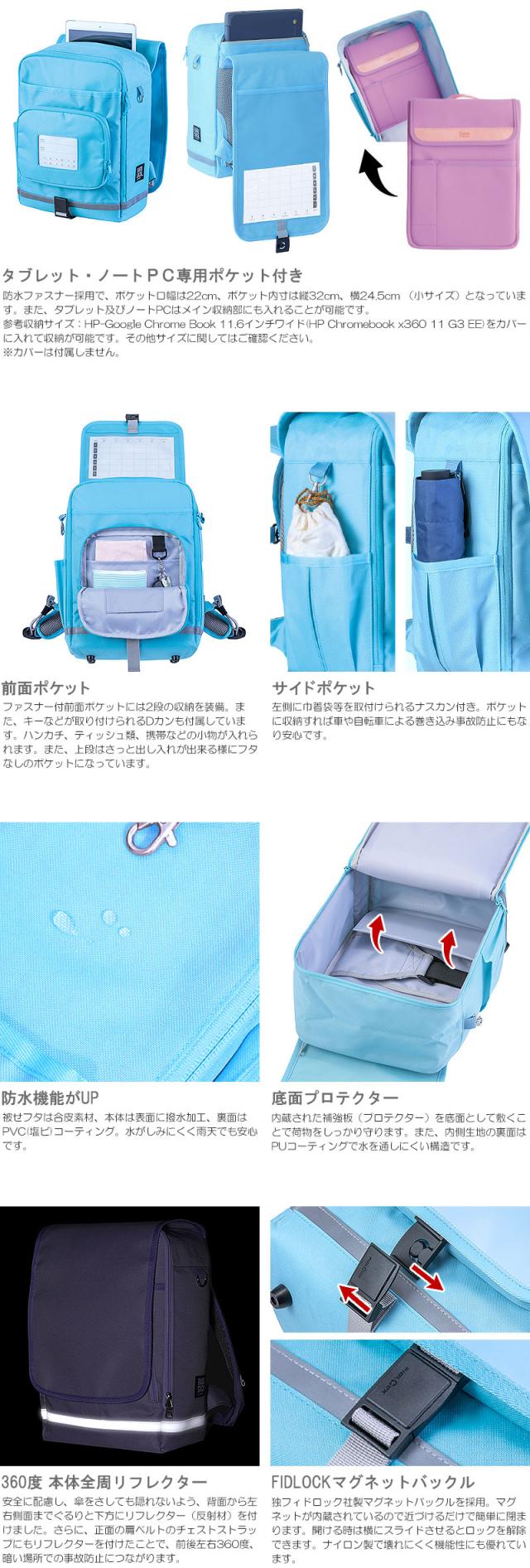かぶせフタの部分を合皮にし、撥水加工を追加。革製のランドセルと見た目の違和感がないデザインに仕上げています。また3Dパターンで形成された肩ベルトを改良し、より体に密着する構造になりました。