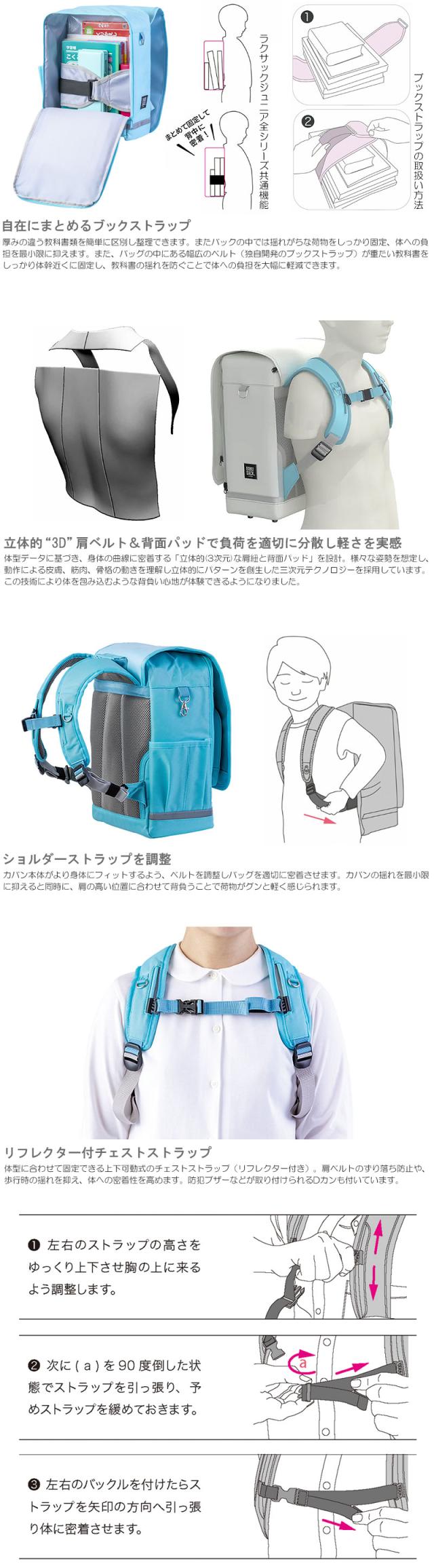 ■ラクサックジュニアの基本機能〜ラクサックが重さを感じにくい理由1.自在にまとめる『ブックストラップ』(商標登録済/特許第6793435号・2020年11月登録)独自開発のブックストラップ(教科書固定ベルト)で厚みの違う教科書を簡単に区別し整理。重い荷物を背中側に密着させ荷物の揺れを防ぎ、身体への負担を最小限に抑えます。2.『立体的3D肩ベルトと背面パッド』で負荷を適切に分散体型データに基づき、身体の曲線に密着する『立体的(3次元)な肩紐と背面パッド』を設計。様々な姿勢を想定し、動作による皮膚、筋肉、骨格の動きを理解し立体的にパターンを創生した三次元テクノロジーを採用しています。この技術により体を包みこむような背負い心地を実現しています。