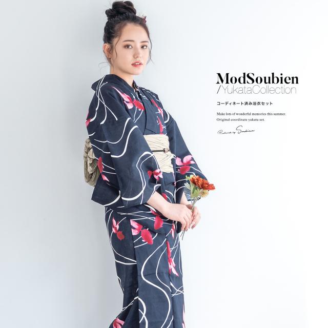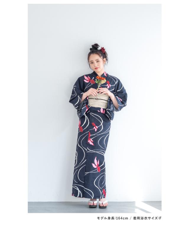 浴衣 セット レディース 浴衣セット 兵児帯 2023 大人 3点セット 濃紺 ダークネイビー 金魚 流水紋 亜麻色 S フリー 送料無料