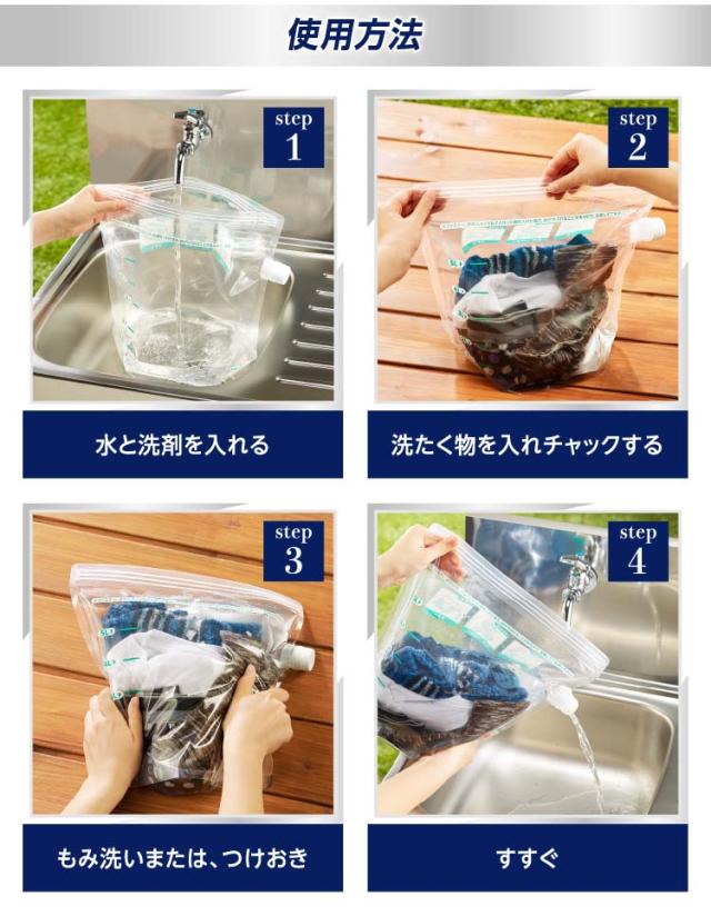 もみ洗いする時は、液がもれないようチャックが完全に閉まっていることを確認する。つけおきの場合、目安は30分〜1時間。