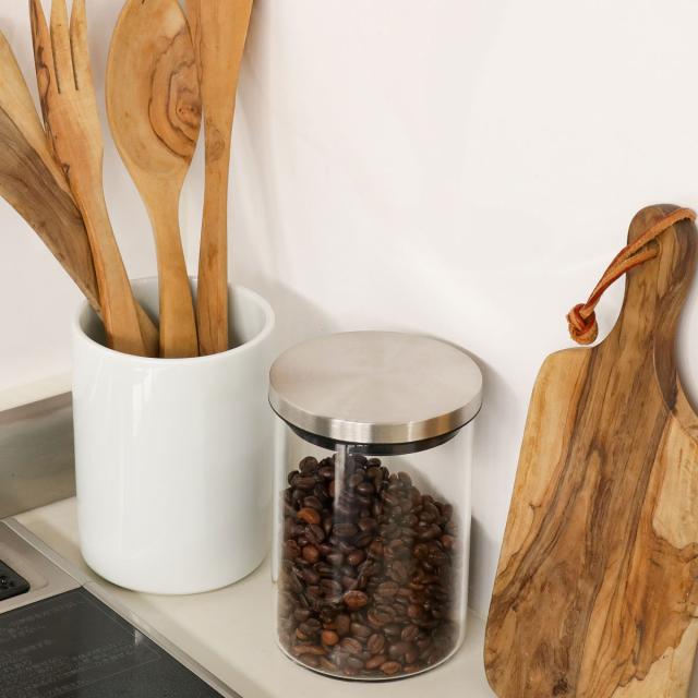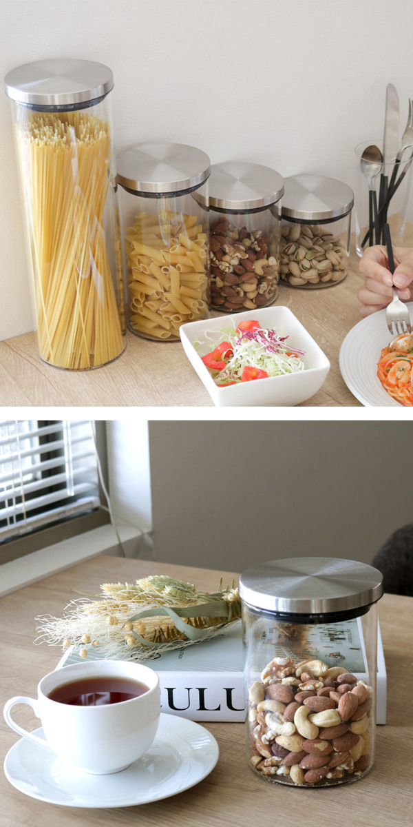 シリアルやナッツ類などの保存にも使いやすく、忙しい朝などもぱぱっと食事の準備ができます。また、コーヒー豆や粉末ドリンクの収納にも使いやすく、コーヒーサーバー横のスペースなどに置いておしゃれなドリンクコーナーを作ることもできます。
