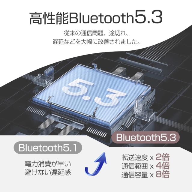 【Bluetooth5.3】最新のBluetooth5.3チップを採用して、旧世代のBluetoothと比較すると省電力や接続の安定性が大幅に向上しています。通信範囲や通信速度が顕著的に良くなりました。途切れや遅延などの状況を極めて抑えています。