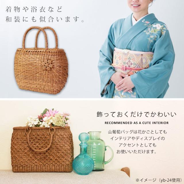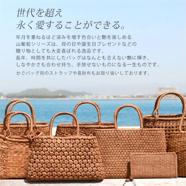 | 商品説明 | 天然山葡萄の蔓(つる)のバッグかごです。山に自生する山葡萄の蔓を贅沢に使用し、熟練の職人さんが手作りで編み上げています。 天然素材の丈夫で美しい一生もののバッグです。 使えば使うほど艶が出て美しく変化していく山葡萄かごバッグは「育てる」バッグです。 必要なものがしっかり収まる程よいサイズ感。自然素材の可愛いシルエットで、マチも十分にあるので普段使いに大活躍のファッションアイテムです。 季節を問わず通年使え、着物にもカジュアルにも似合います。 付属の内布は柿渋染めです。天然素材ならではの温かみのある色合いで、防腐、防虫効果に優れています。柿渋染めは使い込むほどに深みのある色へ変化していきます。 やさしい風合いが山葡萄バックに相性がよろしいです。 お手元に届きましたら、毎日、バッグを手で撫でてあげてください。 山葡萄の皮は油分を吸収する特徴がある為、撫でてあげると手の油を吸収し、ゆっくりとアメ色に変化し光沢が増していきます。 時間とともに自分色に染まるようで、とても愛着が沸きます。変化の時間もお楽しみいただけます。 これを「山葡萄バッグを育てていく」と言いますが、同じバッグでも育て具合で色合いに差が出てくるので世界で一つしかないバッグになります。 <山葡萄バッグができるまで> ・蔓の採取 山葡萄の蔓から取った皮を使い、熟練の職人が丹精込めてひとつひとつ作っています。 人里離れた標高1,000m以上の山奥で昔から寒冷地に自生する植物です。 蔓と言っても太さ10cm以上にもなります。 その蔓を剥ぎ取り乾燥させて、かごバッグの材料となるようサイズを整えていきます。 ・編む 職人が作った木型に合わせて、バッグの底部から編んでいきます。 網目が均等にするには指先の力が強くないと綺麗に仕上げることができません。 最後に細かい毛羽を丁寧に取り除き、かごバッグのできあがりです。 ・技術 丁寧に編み上げられた山葡萄かご編みは、熟練の職人が何日もかけて作り上げていくので大量生産ができず稀少性が高いです。 その為、市場に出回る数も限られています。 ・内布を取り付け ナチュラルでおしゃれな柿渋染めの内布が付いています。天然の柿渋原液を使用し染め上げています。 優しい風合いが山葡萄バックに相性がよろしいです。 内布は縫い付けて固定されていますので、安定した収納ができバッグの中身も安心です。 ・柿渋染めの理由 柿渋には防虫、防カビ、防腐、防臭、消臭などの効果があります。 山葡萄の蔓は正常にご使用、保管していただけば、カビが生えることはありませんが、湿気が多いところで保管すると表面にカビが発生する場合があります。 それを予防目的も兼ねてコストを掛けてでも、山葡萄バッグに柿渋染めの内布を取り付けています。 <山葡萄かごバッグの選び方> 初めて憧れの山葡萄バッグを持つ方は、定番の「網代編み」がとても人気です。 2個目、3個目を購入する方は「六角花編み」や「サイズ違い」をお選びいただく場合が多いです。 山葡萄チャームやお財布もございます。 職人が丁寧に編み上げた籠バッグは世代を超え永く愛することができます。 年月を重ねるほど深みを増す色合いと艶を楽しめる山葡萄シリーズは、母の日や誕生日プレゼントなどの贈り物としても大変喜ばれる逸品です。 長年、時間を共にしたバッグはなんとも言えない艶に輝き、しなやかさも合わせ持ち、手放せないものになる一生ものです。 編み方がおしゃれな山葡萄バッグは花かごとしてもインテリアやディスプレイのアクセントとしてもお使いいただけます。 自然素材をお楽しみください 天然素材を使用し、すべて手編みで手作り品の為、サイズ・重量ともに若干の個体差が生じます。 自然素材特有のささくれ、割れ、色ムラが生じる場合がございます。 ささくれや色ムラ等は、使い込むうちに自然と馴染み、風合いよくなめらかになっていきます。 天然素材を使用している為、予めご理解、ご了承いただき自然の風合いをお楽しみいただければ幸甚です。 |
