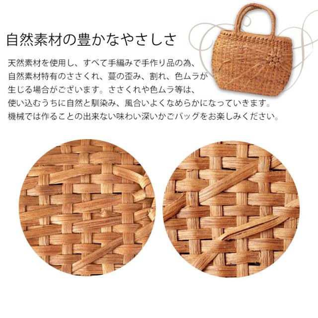 | ご購入に関するご注意 | ・天然素材を使用し、すべて手編みで手作り品の為、サイズ・重量ともに若干の個体差が生じます。 また、自然素材特有のささくれ、蔓の歪み、割れ、色ムラが生じる場合がございます。 ささくれや色ムラ等は、使い込むうちに自然と馴染み、風合いよくなめらかになっていきます。 ・内布もまた天然素材での染めのため、多少色味に違いが生じる場合がございます。 天然素材を使用している為、予めご理解、ご了承いただき自然の風合いをお楽しみいただければ幸甚です。 ・モニター・ディスプレイによっても写り方が変ります。 予めご了承くださいませ。 |