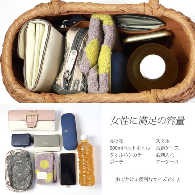 必要なものがしっかり収まる程よいサイズ感。自然素材の可愛いシルエットで、マチも十分にあるので普段使いに大活躍のファッションアイテムです。季節を問わず通年使え、着物にもカジュアルにも似合います。