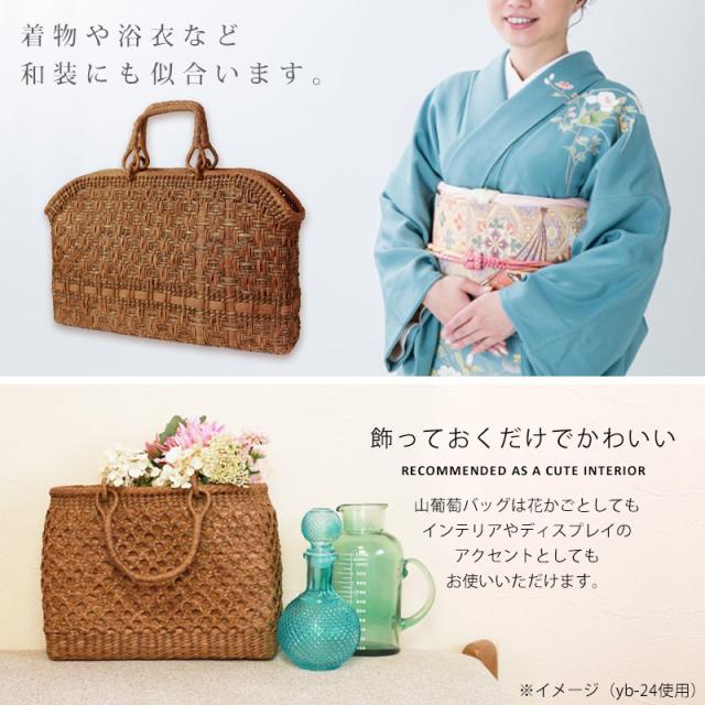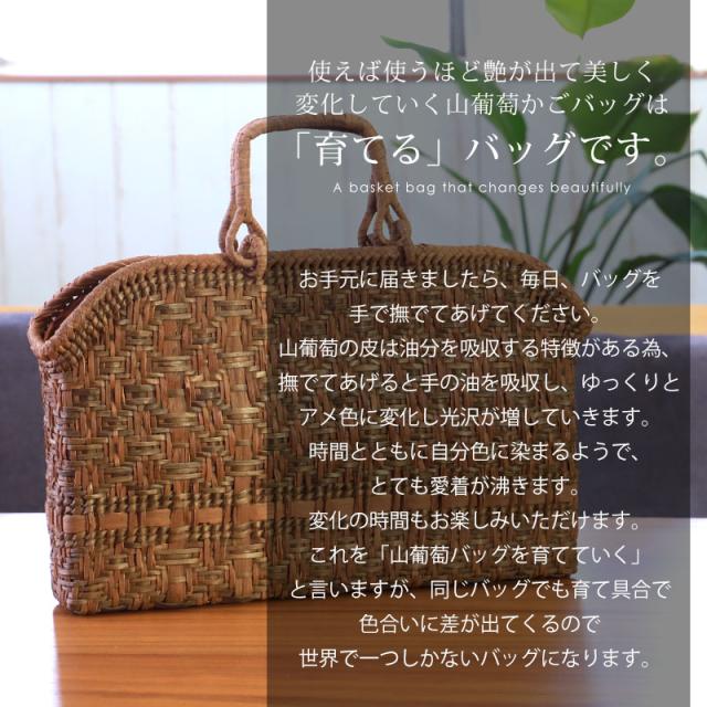 | 商品説明 | 天然山葡萄の蔓(つる)のバッグかごです。山に自生する山葡萄の蔓を贅沢に使用し、熟練の職人さんが手作りで編み上げています。 天然素材の丈夫で美しい一生もののバッグです。 使えば使うほど艶が出て美しく変化していく山葡萄かごバッグは「育てる」バッグです。 必要なものがしっかり収まる程よいサイズ感。自然素材の可愛いシルエットで、マチも十分にあるので普段使いに大活躍のファッションアイテムです。 季節を問わず通年使え、着物にもカジュアルにも似合います。 付属の内布は柿渋染めです。天然素材ならではの温かみのある色合いで、防腐、防虫効果に優れています。柿渋染めは使い込むほどに深みのある色へ変化していきます。 やさしい風合いが山葡萄バックに相性がよろしいです。 お手元に届きましたら、毎日、バッグを手で撫でてあげてください。 山葡萄の皮は油分を吸収する特徴がある為、撫でてあげると手の油を吸収し、ゆっくりとアメ色に変化し光沢が増していきます。 時間とともに自分色に染まるようで、とても愛着が沸きます。変化の時間もお楽しみいただけます。 これを「山葡萄バッグを育てていく」と言いますが、同じバッグでも育て具合で色合いに差が出てくるので世界で一つしかないバッグになります。 <山葡萄バッグができるまで> ・蔓の採取 山葡萄の蔓から取った皮を使い、熟練の職人が丹精込めてひとつひとつ作っています。 人里離れた標高1,000m以上の山奥で昔から寒冷地に自生する植物です。 蔓と言っても太さ10cm以上にもなります。 その蔓を剥ぎ取り乾燥させて、かごバッグの材料となるようサイズを整えていきます。 ・編む 職人が作った木型に合わせて、バッグの底部から編んでいきます。 網目が均等にするには指先の力が強くないと綺麗に仕上げることができません。 最後に細かい毛羽を丁寧に取り除き、かごバッグのできあがりです。 ・技術 丁寧に編み上げられた山葡萄かご編みは、熟練の職人が何日もかけて作り上げていくので大量生産ができず稀少性が高いです。 その為、市場に出回る数も限られています。 ・内布を取り付け ナチュラルでおしゃれな柿渋染めの内布が付いています。天然の柿渋原液を使用し染め上げています。 優しい風合いが山葡萄バックに相性がよろしいです。 内布は縫い付けて固定されていますので、安定した収納ができバッグの中身も安心です。 ・柿渋染めの理由 柿渋には防虫、防カビ、防腐、防臭、消臭などの効果があります。 山葡萄の蔓は正常にご使用、保管していただけば、カビが生えることはありませんが、湿気が多いところで保管すると表面にカビが発生する場合があります。 それを予防目的も兼ねてコストを掛けてでも、山葡萄バッグに柿渋染めの内布を取り付けています。 <山葡萄かごバッグの選び方> 初めて憧れの山葡萄バッグを持つ方は、定番の「網代編み」がとても人気です。 2個目、3個目を購入する方は「六角花編み」や「サイズ違い」をお選びいただく場合が多いです。 山葡萄チャームやお財布もございます。 職人が丁寧に編み上げた籠バッグは世代を超え永く愛することができます。 年月を重ねるほど深みを増す色合いと艶を楽しめる山葡萄シリーズは、母の日や誕生日プレゼントなどの贈り物としても大変喜ばれる逸品です。 長年、時間を共にしたバッグはなんとも言えない艶に輝き、しなやかさも合わせ持ち、手放せないものになる一生ものです。 編み方がおしゃれな山葡萄バッグは花かごとしてもインテリアやディスプレイのアクセントとしてもお使いいただけます。 自然素材をお楽しみください 天然素材を使用し、すべて手編みで手作り品の為、サイズ・重量ともに若干の個体差が生じます。 自然素材特有のささくれ、割れ、色ムラが生じる場合がございます。 ささくれや色ムラ等は、使い込むうちに自然と馴染み、風合いよくなめらかになっていきます。 天然素材を使用している為、予めご理解、ご了承いただき自然の風合いをお楽しみいただければ幸甚です。 |