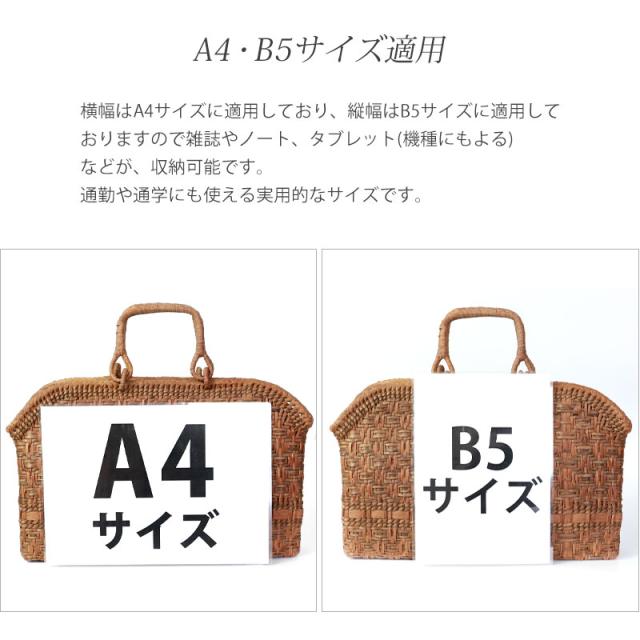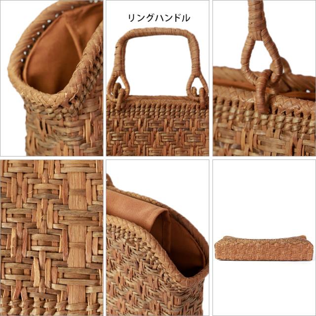 | 仕様 | 一番皮網代編み リングハンドル 柿渋染め内布(かぶせ付 内ポケット付き) 取り扱い説明書 保証書付き |