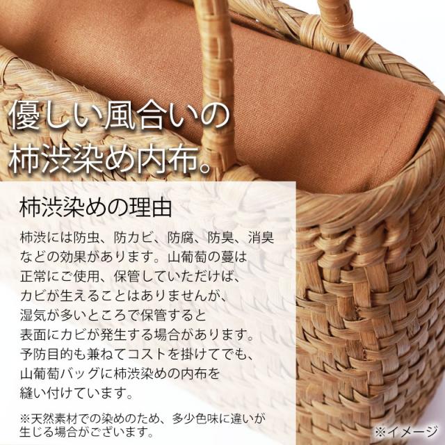 付属の内布は柿渋染めです。天然素材ならではの温かみのある色合いで、防腐、防虫効果に優れています。柿渋染めは使い込むほどに深みのある色へ変化していきます。やさしい風合いが山葡萄バックに相性がよろしいです。山葡萄 かごバッグ 1年保証付き 内布付き 山ぶどう やまぶどう 蔓 天然素材 カゴバッグ 籠バッグ バスケット レディース 大人 おしゃれ 綺麗 一番皮網代編み リングハンドル 手提げ ハンドメイド 手作り 母の日