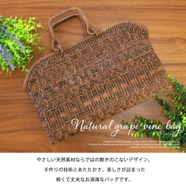 天然山葡萄の蔓(つる)のバッグかごです。山に自生する山葡萄の蔓を贅沢に使用し、熟練の職人さんが手作りで編み上げています。天然素材の丈夫で美しい一生もののバッグです。