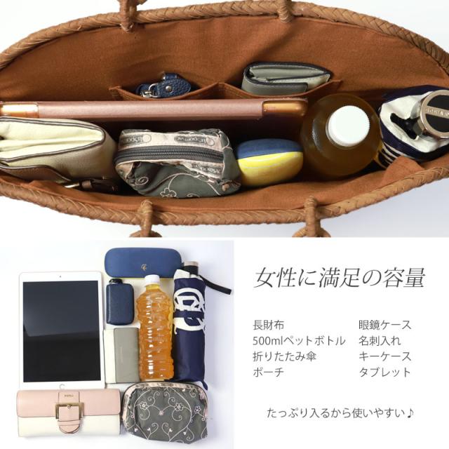 必要なものがしっかり収まる程よいサイズ感。自然素材の可愛いシルエットで、マチも十分にあるので普段使いに大活躍のファッションアイテムです。季節を問わず通年使え、着物にもカジュアルにも似合います。