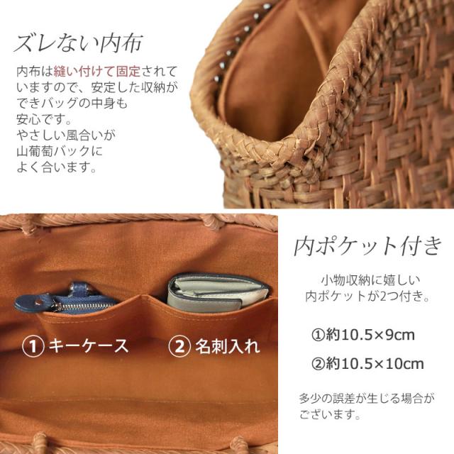 | 素材 | 鞄本体:天然山葡萄蔓 内布:綿100%(柿渋染め) |