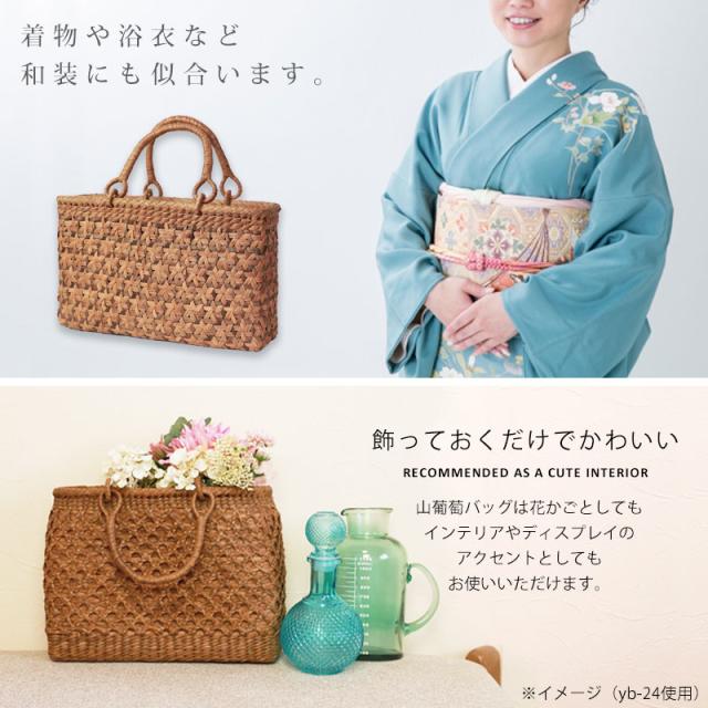 | 商品説明 | 天然山葡萄の蔓(つる)のバッグかごです。山に自生する山葡萄の蔓を贅沢に使用し、熟練の職人さんが手作りで編み上げています。 天然素材の丈夫で美しい一生もののバッグです。 使えば使うほど艶が出て美しく変化していく山葡萄かごバッグは「育てる」バッグです。 必要なものがしっかり収まる程よいサイズ感。自然素材の可愛いシルエットで、マチも十分にあるので普段使いに大活躍のファッションアイテムです。 季節を問わず通年使え、着物にもカジュアルにも似合います。 付属の内布は柿渋染めです。天然素材ならではの温かみのある色合いで、防腐、防虫効果に優れています。柿渋染めは使い込むほどに深みのある色へ変化していきます。 やさしい風合いが山葡萄バックに相性がよろしいです。 お手元に届きましたら、毎日、バッグを手で撫でてあげてください。 山葡萄の皮は油分を吸収する特徴がある為、撫でてあげると手の油を吸収し、ゆっくりとアメ色に変化し光沢が増していきます。 時間とともに自分色に染まるようで、とても愛着が沸きます。変化の時間もお楽しみいただけます。 これを「山葡萄バッグを育てていく」と言いますが、同じバッグでも育て具合で色合いに差が出てくるので世界で一つしかないバッグになります。 <山葡萄バッグができるまで> ・蔓の採取 山葡萄の蔓から取った皮を使い、熟練の職人が丹精込めてひとつひとつ作っています。 人里離れた標高1,000m以上の山奥で昔から寒冷地に自生する植物です。 蔓と言っても太さ10cm以上にもなります。 その蔓を剥ぎ取り乾燥させて、かごバッグの材料となるようサイズを整えていきます。 ・編む 職人が作った木型に合わせて、バッグの底部から編んでいきます。 網目が均等にするには指先の力が強くないと綺麗に仕上げることができません。 最後に細かい毛羽を丁寧に取り除き、かごバッグのできあがりです。 ・技術 丁寧に編み上げられた山葡萄かご編みは、熟練の職人が何日もかけて作り上げていくので大量生産ができず稀少性が高いです。 その為、市場に出回る数も限られています。 ・内布を取り付け ナチュラルでおしゃれな柿渋染めの内布が付いています。天然の柿渋原液を使用し染め上げています。 優しい風合いが山葡萄バックに相性がよろしいです。 内布は縫い付けて固定されていますので、安定した収納ができバッグの中身も安心です。 ・柿渋染めの理由 柿渋には防虫、防カビ、防腐、防臭、消臭などの効果があります。 山葡萄の蔓は正常にご使用、保管していただけば、カビが生えることはありませんが、湿気が多いところで保管すると表面にカビが発生する場合があります。 それを予防目的も兼ねてコストを掛けてでも、山葡萄バッグに柿渋染めの内布を取り付けています。 <山葡萄かごバッグの選び方> 初めて憧れの山葡萄バッグを持つ方は、定番の「網代編み」がとても人気です。 2個目、3個目を購入する方は「六角花編み」や「サイズ違い」をお選びいただく場合が多いです。 山葡萄チャームやお財布もございます。 職人が丁寧に編み上げた籠バッグは世代を超え永く愛することができます。 年月を重ねるほど深みを増す色合いと艶を楽しめる山葡萄シリーズは、母の日や誕生日プレゼントなどの贈り物としても大変喜ばれる逸品です。 長年、時間を共にしたバッグはなんとも言えない艶に輝き、しなやかさも合わせ持ち、手放せないものになる一生ものです。 編み方がおしゃれな山葡萄バッグは花かごとしてもインテリアやディスプレイのアクセントとしてもお使いいただけます。 自然素材をお楽しみください 天然素材を使用し、すべて手編みで手作り品の為、サイズ・重量ともに若干の個体差が生じます。 自然素材特有のささくれ、割れ、色ムラが生じる場合がございます。 ささくれや色ムラ等は、使い込むうちに自然と馴染み、風合いよくなめらかになっていきます。 天然素材を使用している為、予めご理解、ご了承いただき自然の風合いをお楽しみいただければ幸甚です。 |