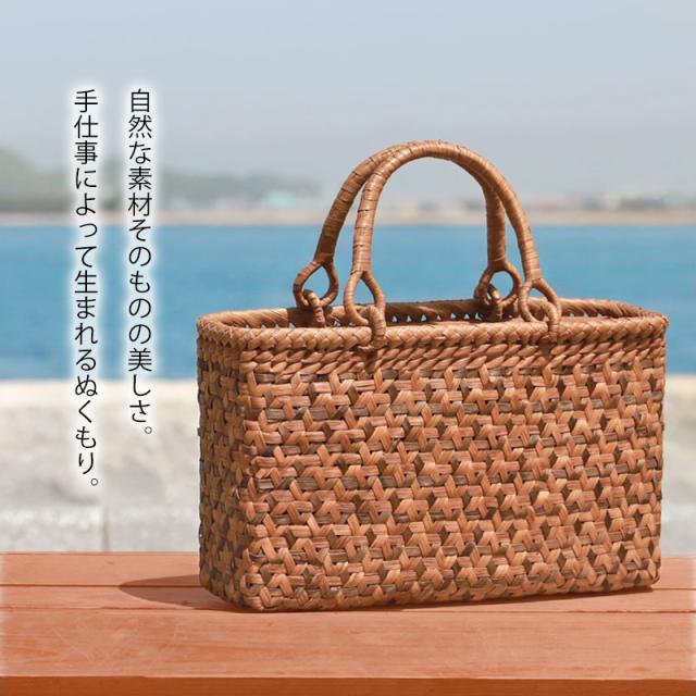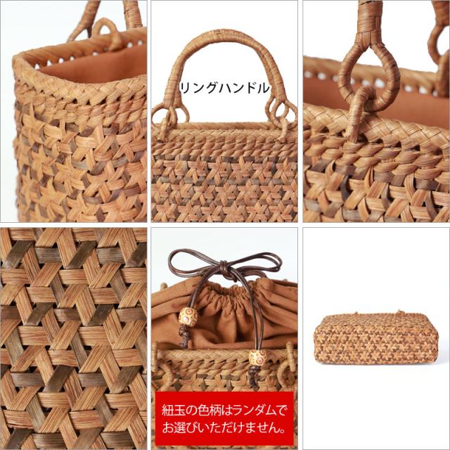 | 仕様 | 網代編み リングハンドル 柿渋染め内布(巾着 内ポケット付き) 取り扱い説明書 保証書付き |