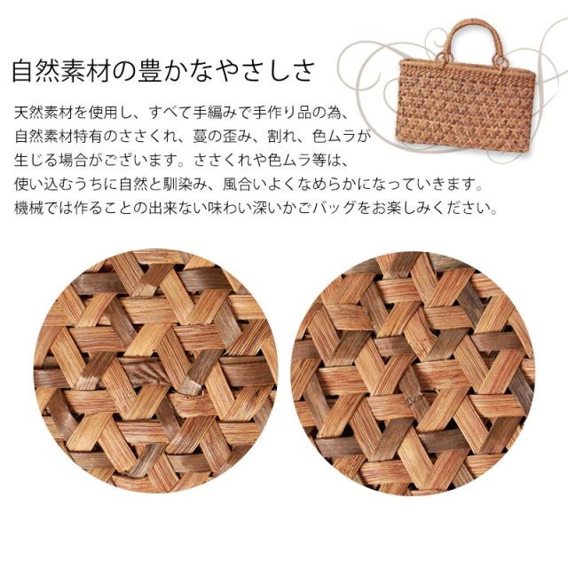 | ご購入に関するご注意 | ・天然素材を使用し、すべて手編みで手作り品の為、サイズ・重量ともに若干の個体差が生じます。 また、自然素材特有のささくれ、蔓の歪み、割れ、色ムラが生じる場合がございます。 ささくれや色ムラ等は、使い込むうちに自然と馴染み、風合いよくなめらかになっていきます。 ・内布もまた天然素材での染めのため、多少色味に違いが生じる場合がございます。 天然素材を使用している為、予めご理解、ご了承いただき自然の風合いをお楽しみいただければ幸甚です。 ・モニター・ディスプレイによっても写り方が変ります。 予めご了承くださいませ。 |