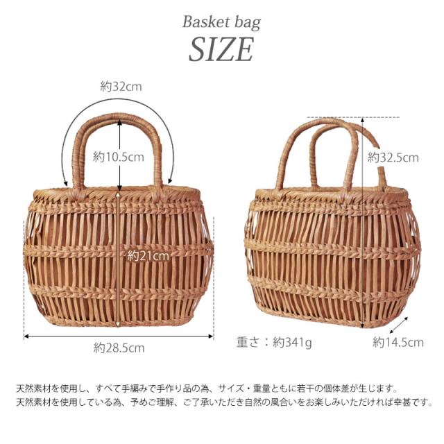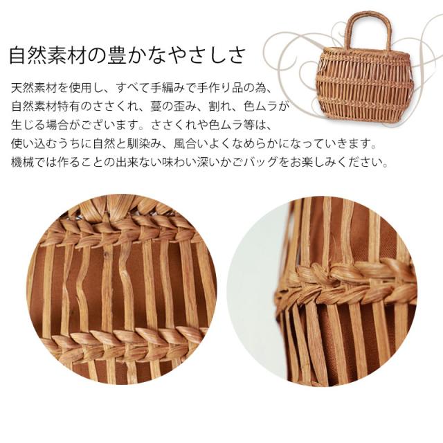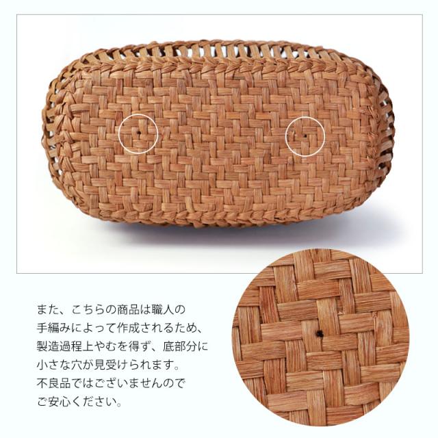 | ご購入に関するご注意 | ・天然素材を使用し、すべて手編みで手作り品の為、サイズ・重量ともに若干の個体差が生じます。 また、自然素材特有のささくれ、蔓の歪み、割れ、色ムラが生じる場合がございます。 ささくれや色ムラ等は、使い込むうちに自然と馴染み、風合いよくなめらかになっていきます。 ・内布もまた天然素材での染めのため、多少色味に違いが生じる場合がございます。 天然素材を使用している為、予めご理解、ご了承いただき自然の風合いをお楽しみいただければ幸甚です。 ・モニター・ディスプレイによっても写り方が変ります。 予めご了承くださいませ。 |