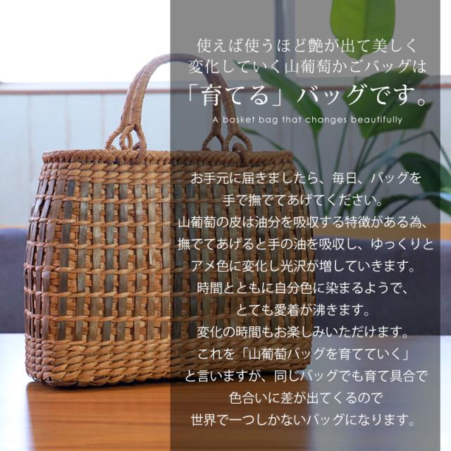 | 商品説明 | 天然山葡萄の蔓(つる)のバッグかごです。山に自生する山葡萄の蔓を贅沢に使用し、熟練の職人さんが手作りで編み上げています。 天然素材の丈夫で美しい一生もののバッグです。 使えば使うほど艶が出て美しく変化していく山葡萄かごバッグは「育てる」バッグです。 必要なものがしっかり収まる程よいサイズ感。自然素材の可愛いシルエットで、マチも十分にあるので普段使いに大活躍のファッションアイテムです。 季節を問わず通年使え、着物にもカジュアルにも似合います。 付属の内布は柿渋染めです。天然素材ならではの温かみのある色合いで、防腐、防虫効果に優れています。柿渋染めは使い込むほどに深みのある色へ変化していきます。 やさしい風合いが山葡萄バックに相性がよろしいです。 お手元に届きましたら、毎日、バッグを手で撫でてあげてください。 山葡萄の皮は油分を吸収する特徴がある為、撫でてあげると手の油を吸収し、ゆっくりとアメ色に変化し光沢が増していきます。 時間とともに自分色に染まるようで、とても愛着が沸きます。変化の時間もお楽しみいただけます。 これを「山葡萄バッグを育てていく」と言いますが、同じバッグでも育て具合で色合いに差が出てくるので世界で一つしかないバッグになります。 <山葡萄バッグができるまで> ・蔓の採取 山葡萄の蔓から取った皮を使い、熟練の職人が丹精込めてひとつひとつ作っています。 人里離れた標高1,000m以上の山奥で昔から寒冷地に自生する植物です。 蔓と言っても太さ10cm以上にもなります。 その蔓を剥ぎ取り乾燥させて、かごバッグの材料となるようサイズを整えていきます。 ・編む 職人が作った木型に合わせて、バッグの底部から編んでいきます。 網目が均等にするには指先の力が強くないと綺麗に仕上げることができません。 最後に細かい毛羽を丁寧に取り除き、かごバッグのできあがりです。 ・技術 丁寧に編み上げられた山葡萄かご編みは、熟練の職人が何日もかけて作り上げていくので大量生産ができず稀少性が高いです。 その為、市場に出回る数も限られています。 ・内布を取り付け ナチュラルでおしゃれな柿渋染めの内布が付いています。天然の柿渋原液を使用し染め上げています。 優しい風合いが山葡萄バックに相性がよろしいです。 内布は縫い付けて固定されていますので、安定した収納ができバッグの中身も安心です。 ・柿渋染めの理由 柿渋には防虫、防カビ、防腐、防臭、消臭などの効果があります。 山葡萄の蔓は正常にご使用、保管していただけば、カビが生えることはありませんが、湿気が多いところで保管すると表面にカビが発生する場合があります。 それを予防目的も兼ねてコストを掛けてでも、山葡萄バッグに柿渋染めの内布を取り付けています。 <山葡萄かごバッグの選び方> 初めて憧れの山葡萄バッグを持つ方は、定番の「網代編み」がとても人気です。 2個目、3個目を購入する方は「六角花編み」や「サイズ違い」をお選びいただく場合が多いです。 山葡萄チャームやお財布もございます。 職人が丁寧に編み上げた籠バッグは世代を超え永く愛することができます。 年月を重ねるほど深みを増す色合いと艶を楽しめる山葡萄シリーズは、母の日や誕生日プレゼントなどの贈り物としても大変喜ばれる逸品です。 長年、時間を共にしたバッグはなんとも言えない艶に輝き、しなやかさも合わせ持ち、手放せないものになる一生ものです。 編み方がおしゃれな山葡萄バッグは花かごとしてもインテリアやディスプレイのアクセントとしてもお使いいただけます。 自然素材をお楽しみください 天然素材を使用し、すべて手編みで手作り品の為、サイズ・重量ともに若干の個体差が生じます。 自然素材特有のささくれ、割れ、色ムラが生じる場合がございます。 ささくれや色ムラ等は、使い込むうちに自然と馴染み、風合いよくなめらかになっていきます。 天然素材を使用している為、予めご理解、ご了承いただき自然の風合いをお楽しみいただければ幸甚です。 |