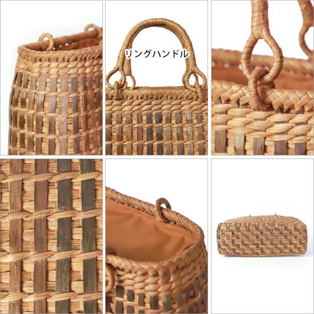 | 仕様 | 網代編み リングハンドル 柿渋染め内布(かぶせ付 内ポケット付き) 取り扱い説明書 保証書付き |
